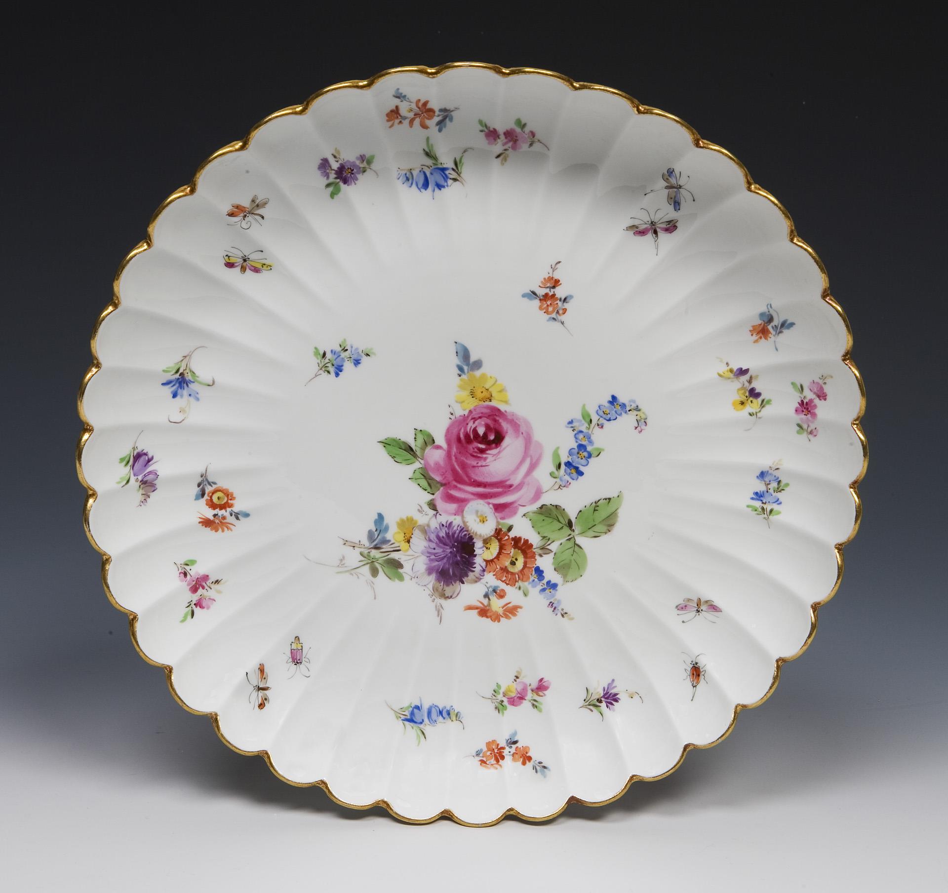 "New cut-out" shape, painted in color, gold painted, "Flowers and insects" decoration. 30 pieces: 6 dinner plates, 6 soup plates, 6 large dessert plates, 6 small dessert plates, 1 round fan-shaped bowl, 1 oval bowl, 1 oval platter, 1 footed bowl with handles in relief (formerly with lid), 1 square bowl, 1 ladle. Press marks, sword marks, large dessert plate 1981. One gold rim rubbed.