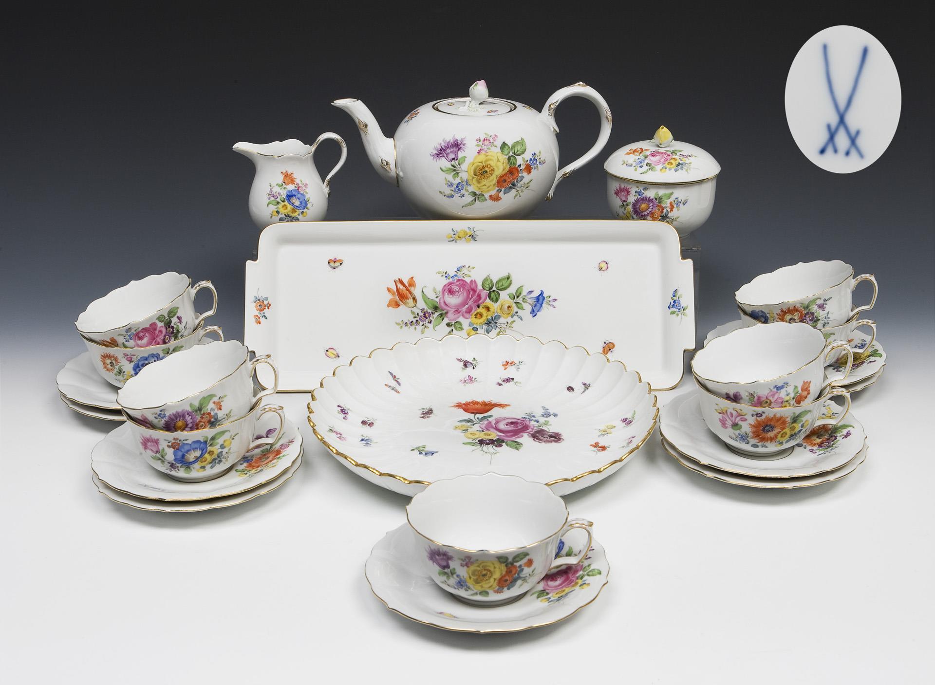 "New cut-out" shape, painted in color, gold painted, "Flowers and insects" decoration. 21 pieces: Teapot, sugar bowl, milk jug, tray, pastry bowl, 9 teacups, 9 saucers. Press marks, painter's marks, sword marks, bowl 1935-1947, one saucer 1990.