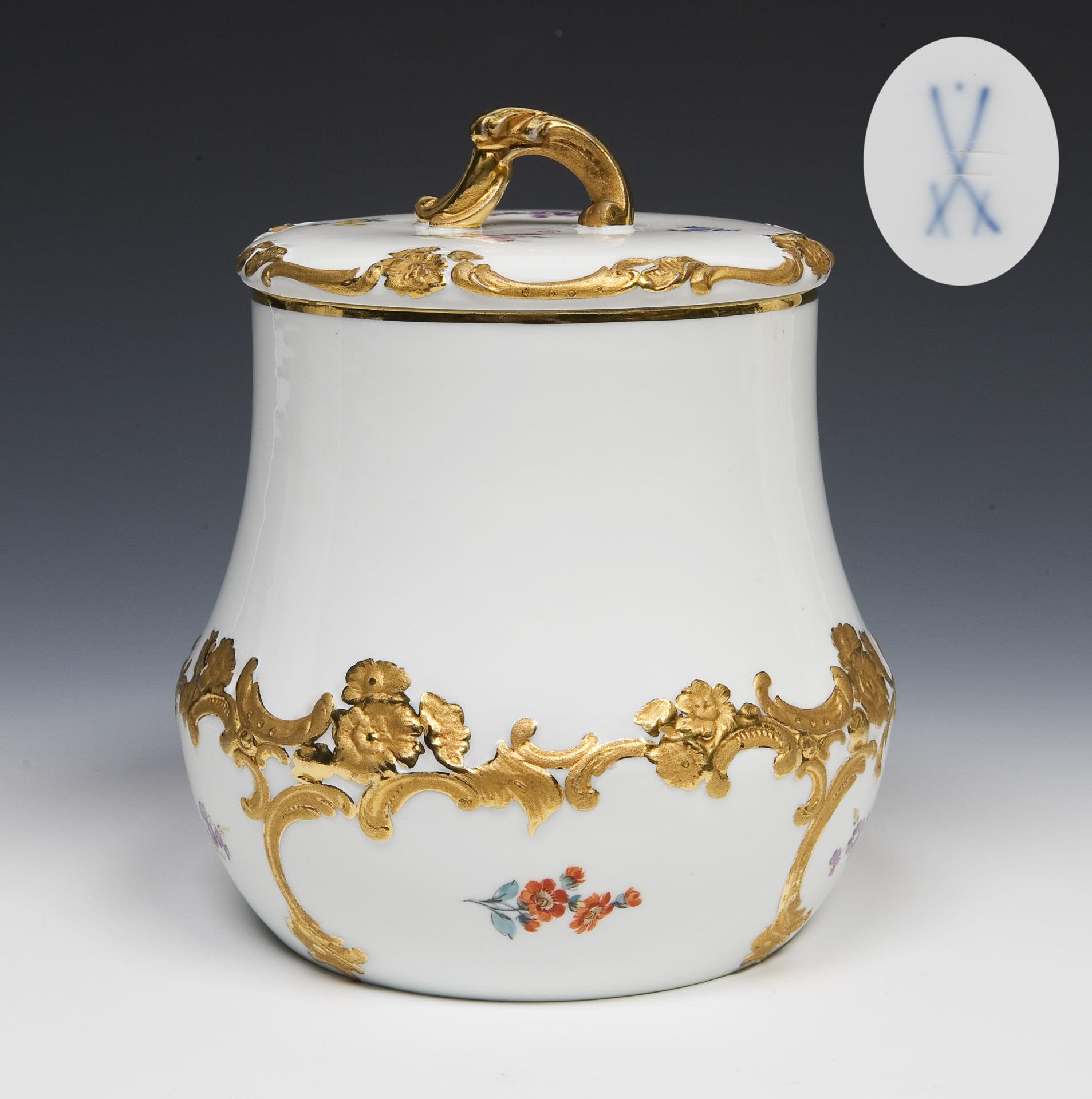 Model year: 1900-1902. Gilt relief decoration with flowers and rocailles, painted in color, "scattered flower decoration", gold staffage. Incised mark, impressed mark, painter's mark, crossed swords mark with dot, brush-stroked twice.