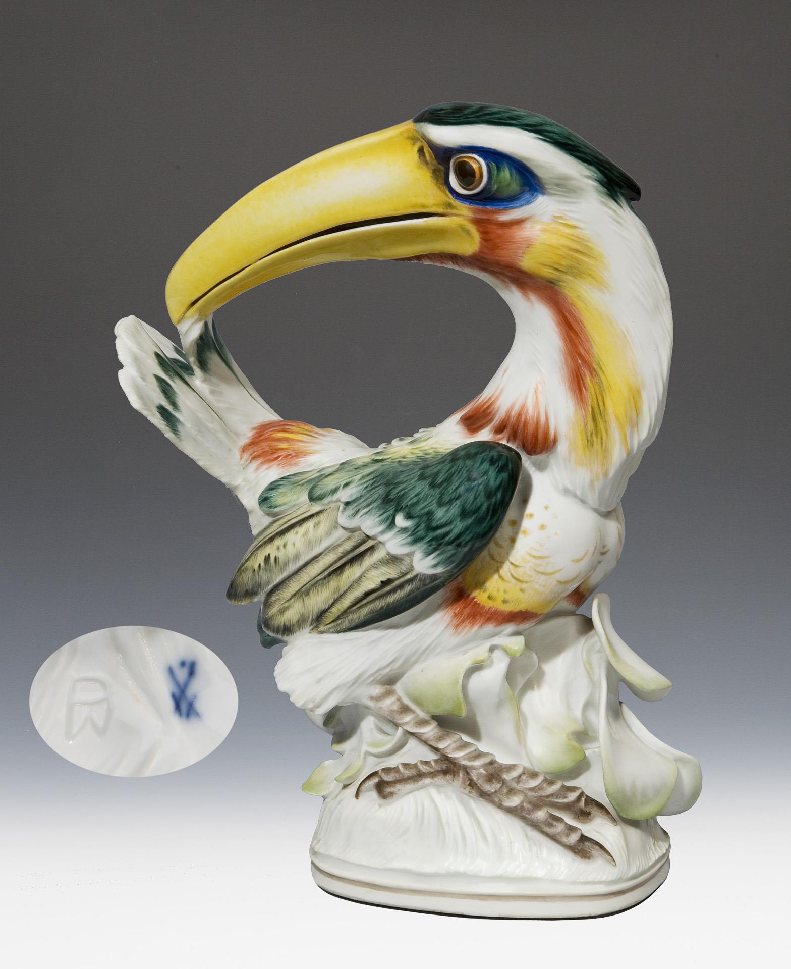 Model year: 1927, naturalistically painted, impressed mark, sword mark with dot on the base, artist's signet. Neck and base rim minimally bumped, one feather visible on the rim minimally restored, some brown glaze spots.