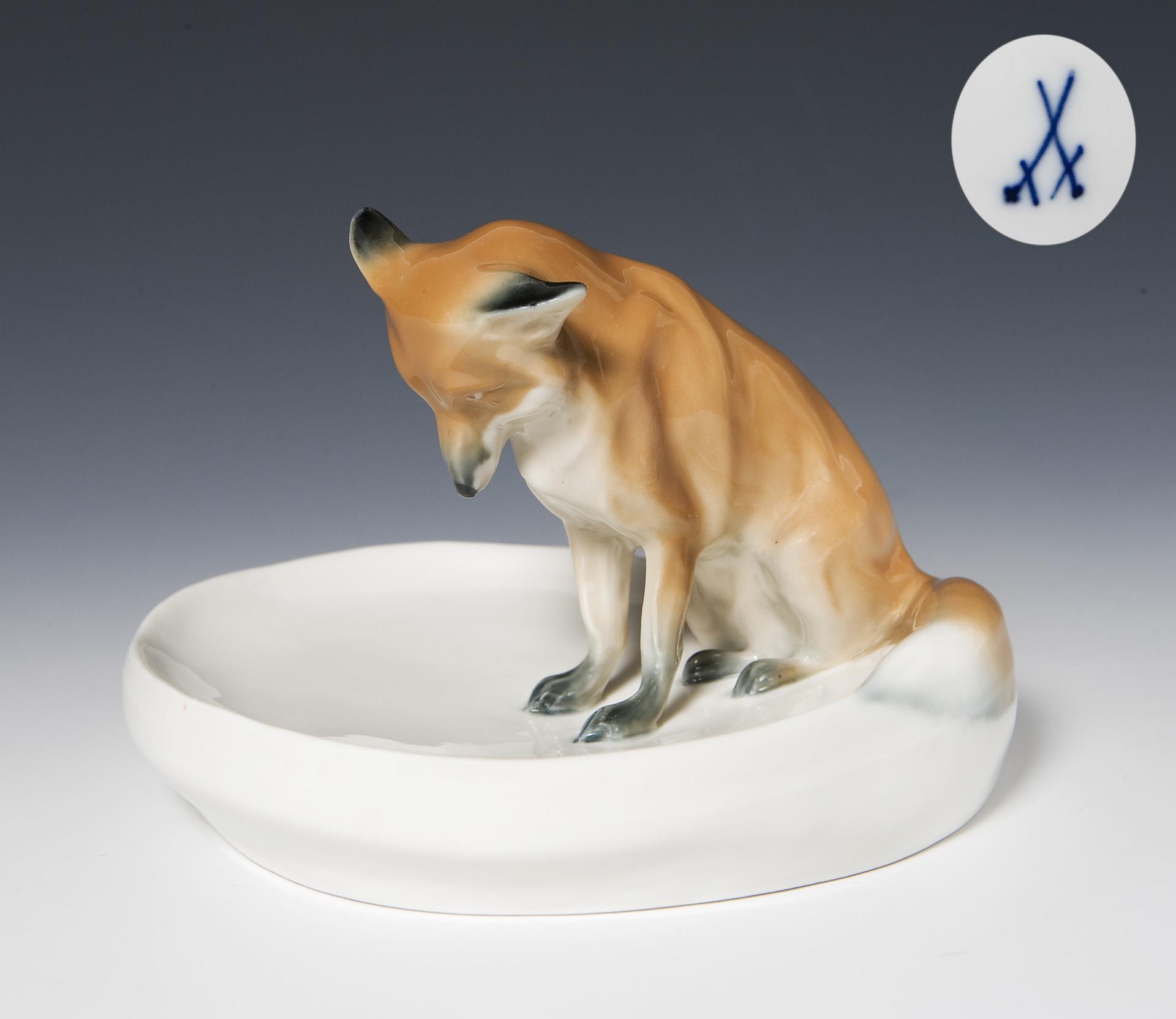 Art Nouveau animal figurine: fox on bowl. Meissen.