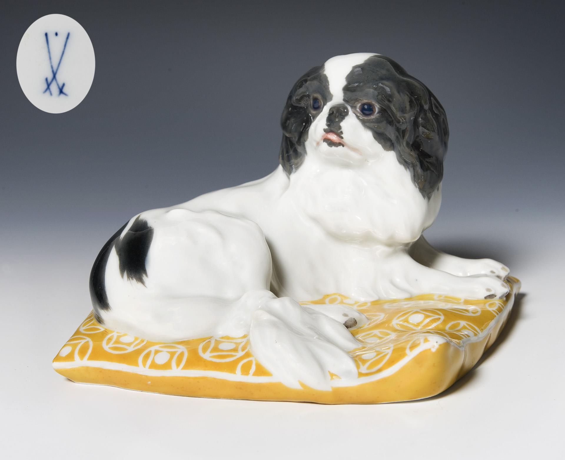 Animal figure: Japan Chin on cushion. Meissen.