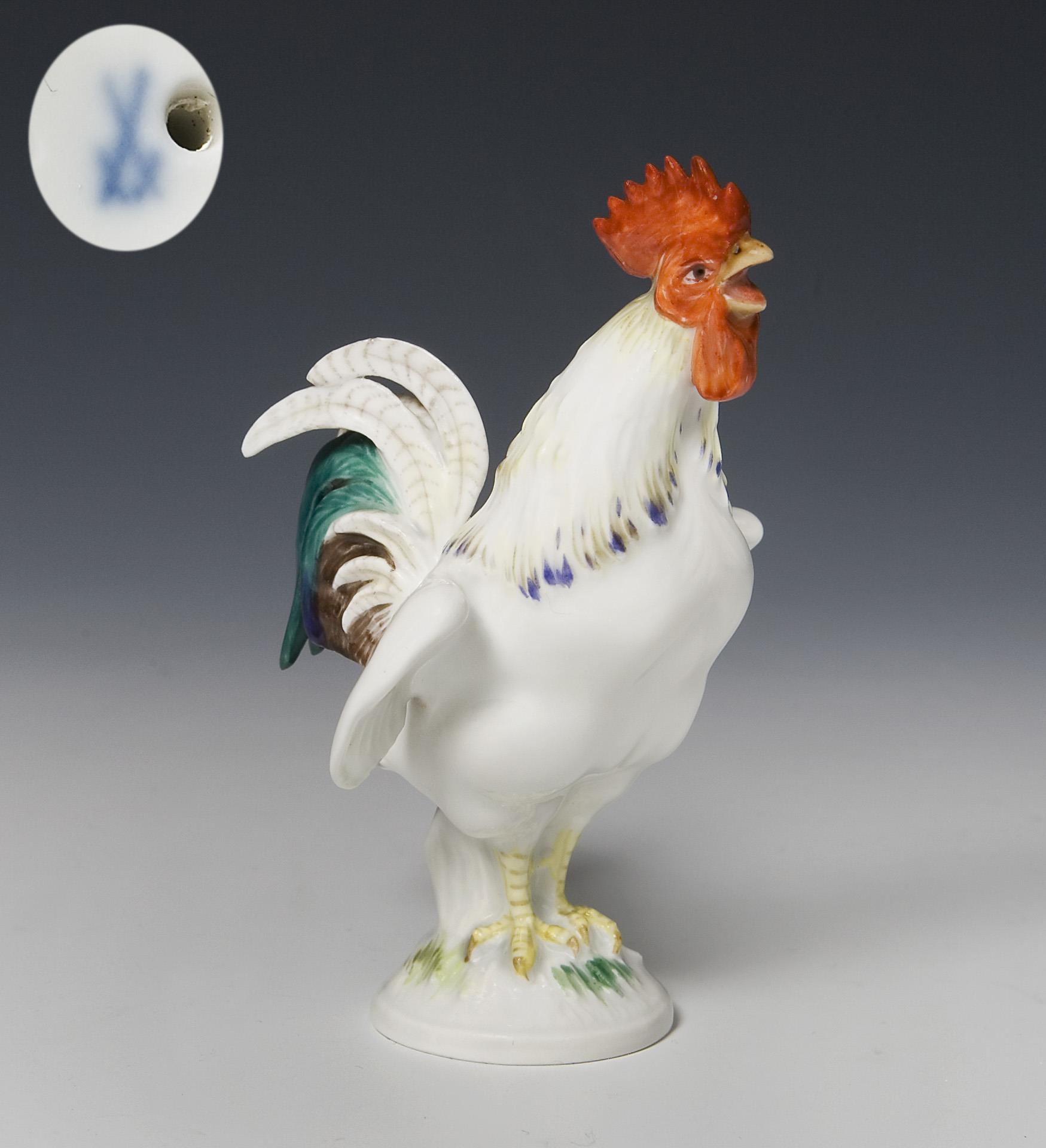 Model year: 1907, naturalistically painted, pressed marks, sword mark. Cock's crest tips, tail feathers restored.
