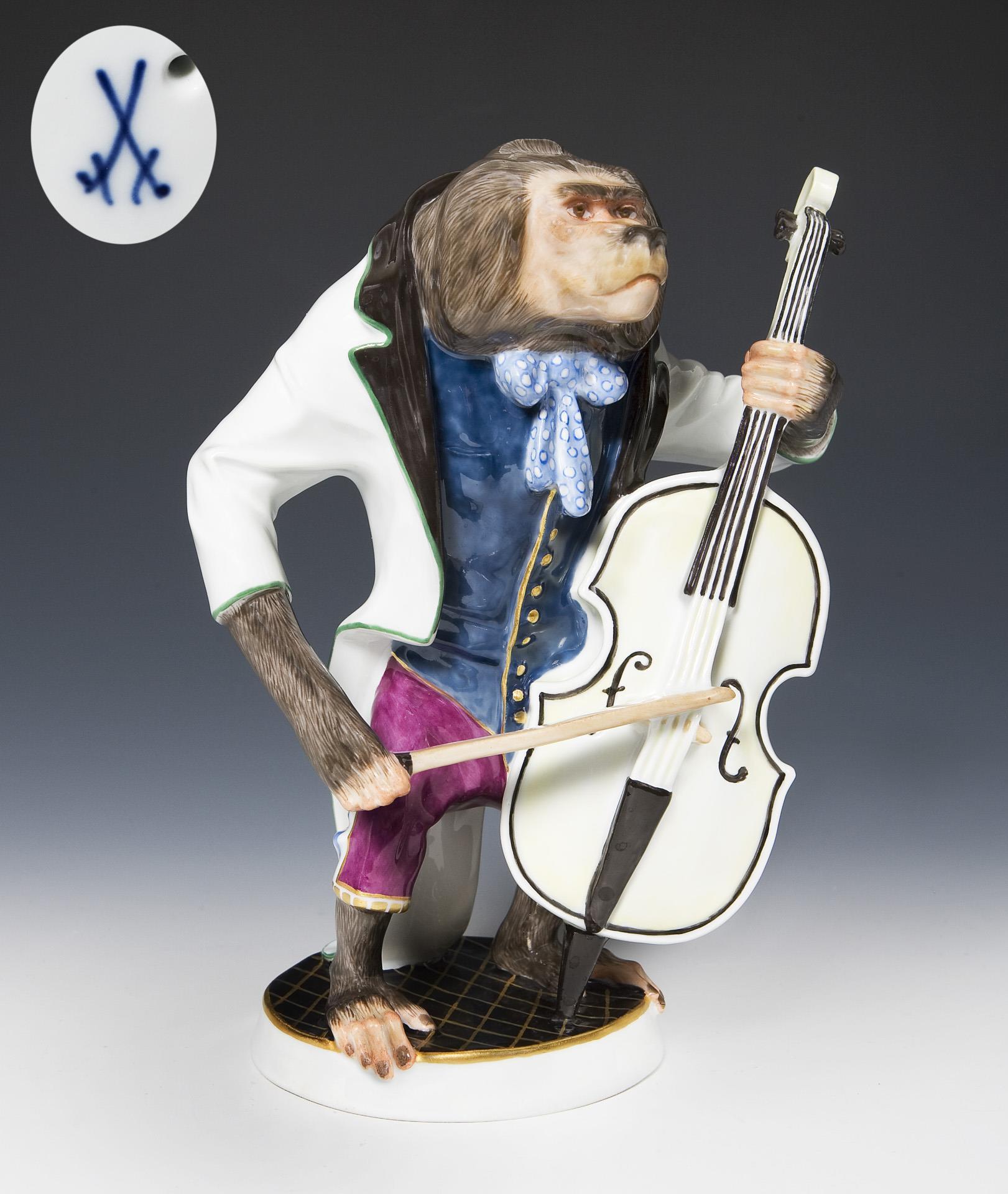 Art Nouveau figure of the monkey chapel: mantled baboon as bass violinist. Meissen.