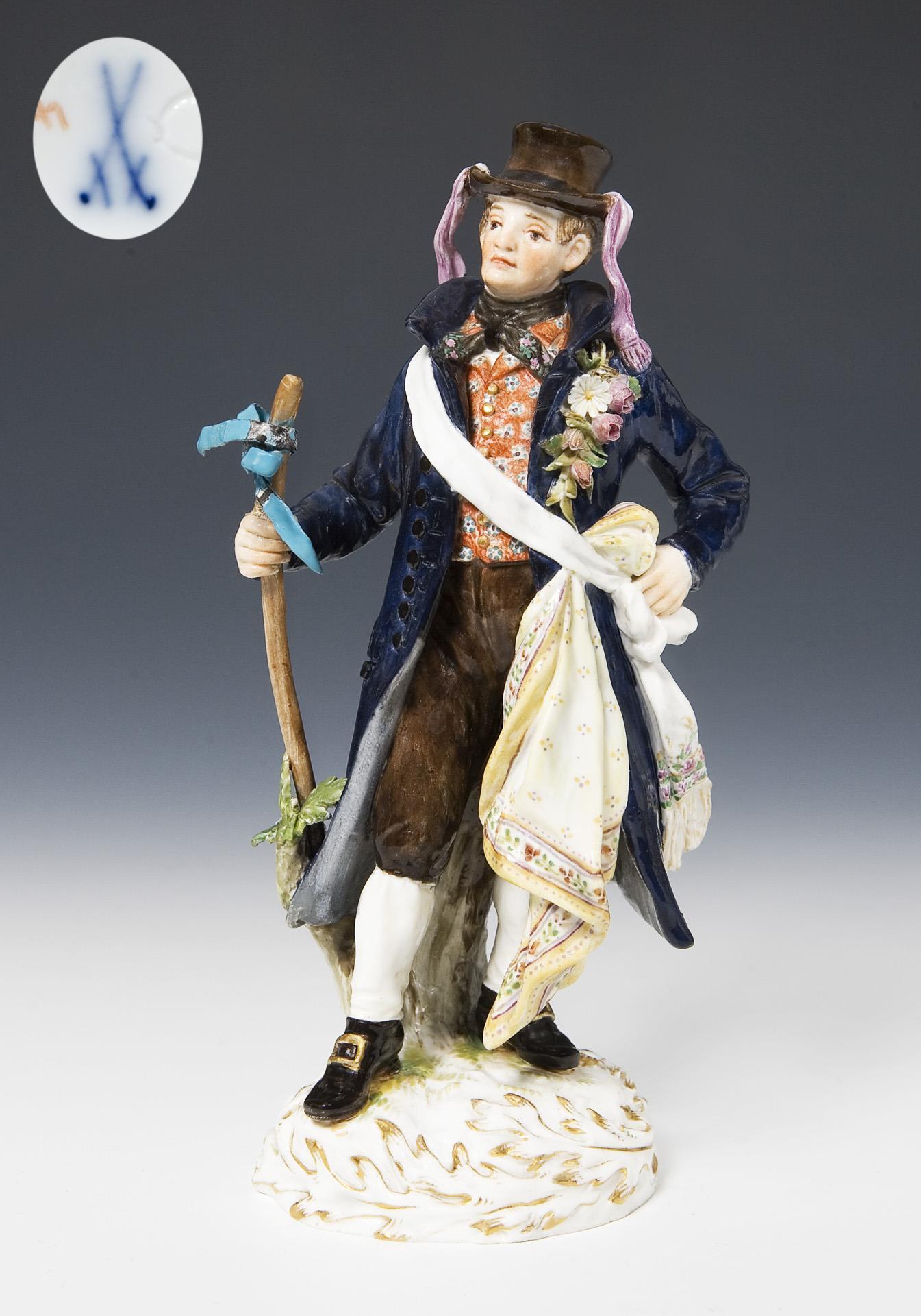 Model year: 1897-1898, from a series of 25 figures. Painted in color, gold painted, incised mark, press mark, painter's mark, sword mark,. Stick tip with bow, some leaves, one mantel corner, front hat brim restored, some leaves bumped.