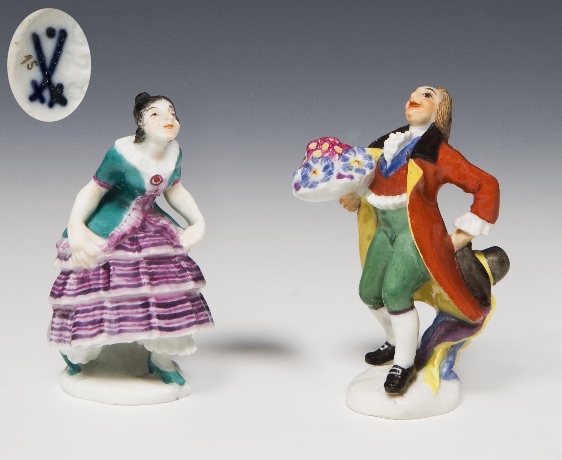 Pair of miniature figurines: cavalier and lady. Meissen.