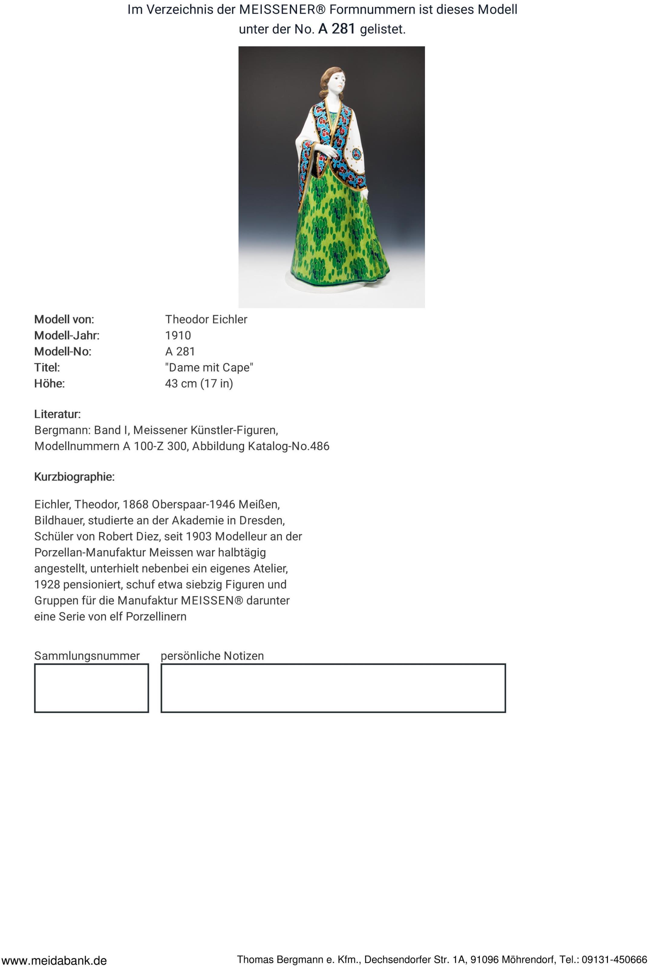 Eichler, sculptor, studied at the academy in Dresden. Pupil of Robert Diez, modeller at the manufactory since 1903, was employed part-time, ran his own studio on the side, retired in 1928 * Partner auction Bergmann.