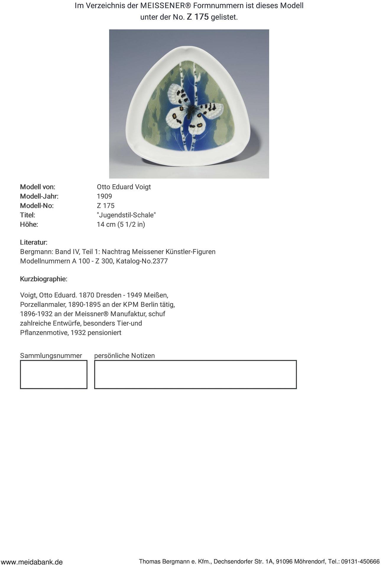 Voigt, porcelain painter, worked 1890-1895 at KPM Berlin, 1896-1932 at the Meissen manufactory, created numerous designs, especially animal and plant motifs, retired in 1932 * Partner auction Bergmann.