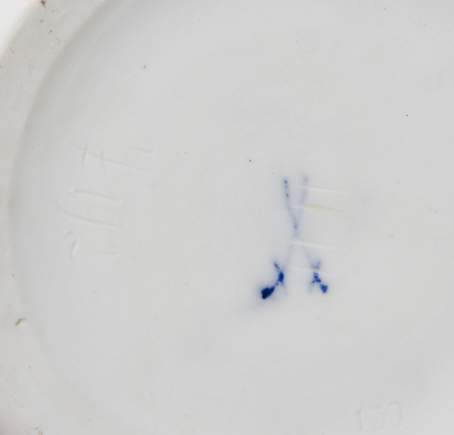 Model year: 1909, relief lid with colored underglaze painting. Incised mark, pressed mark, sword mark crossed out four times. A dark glaze dot on the wall.