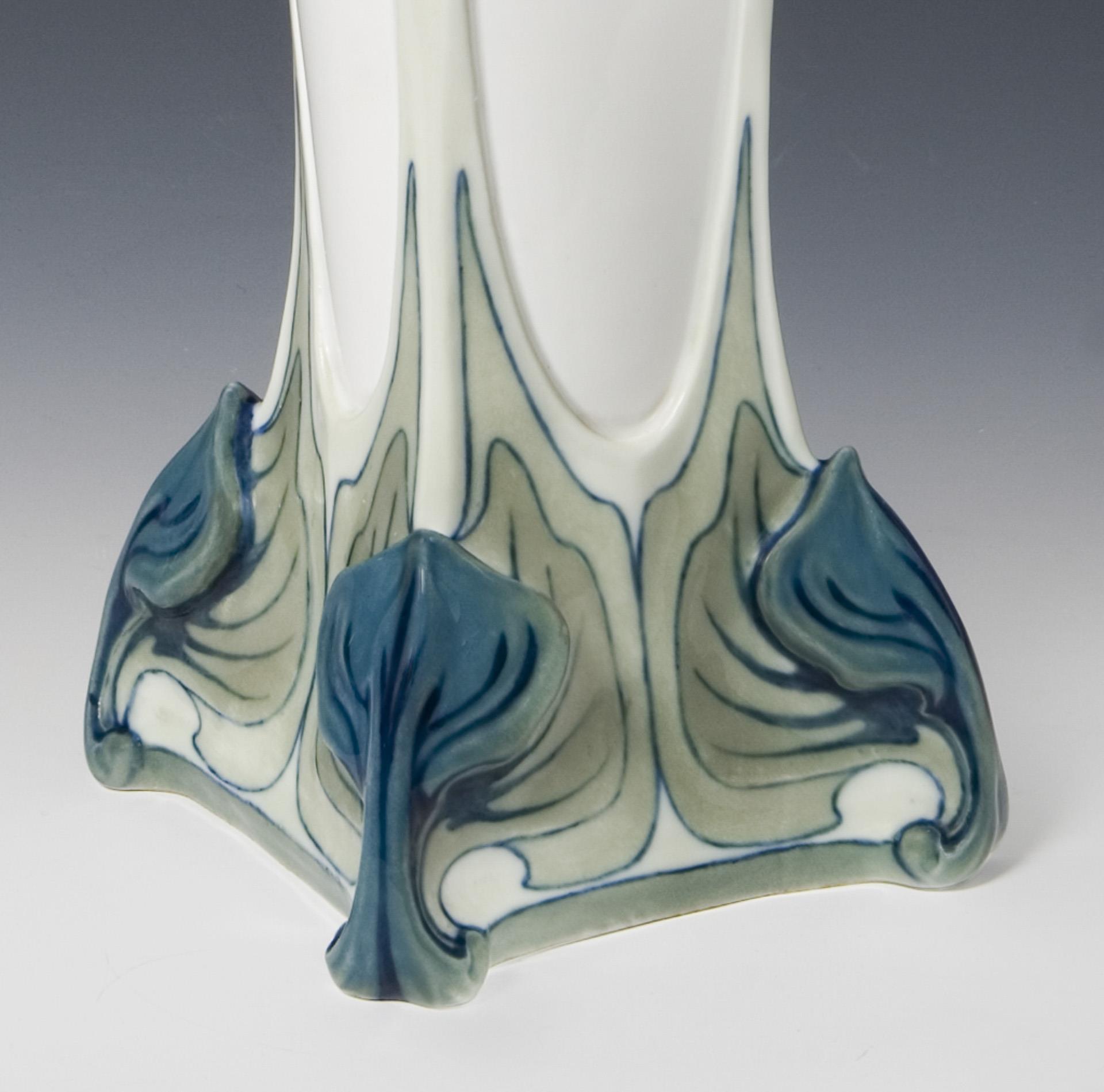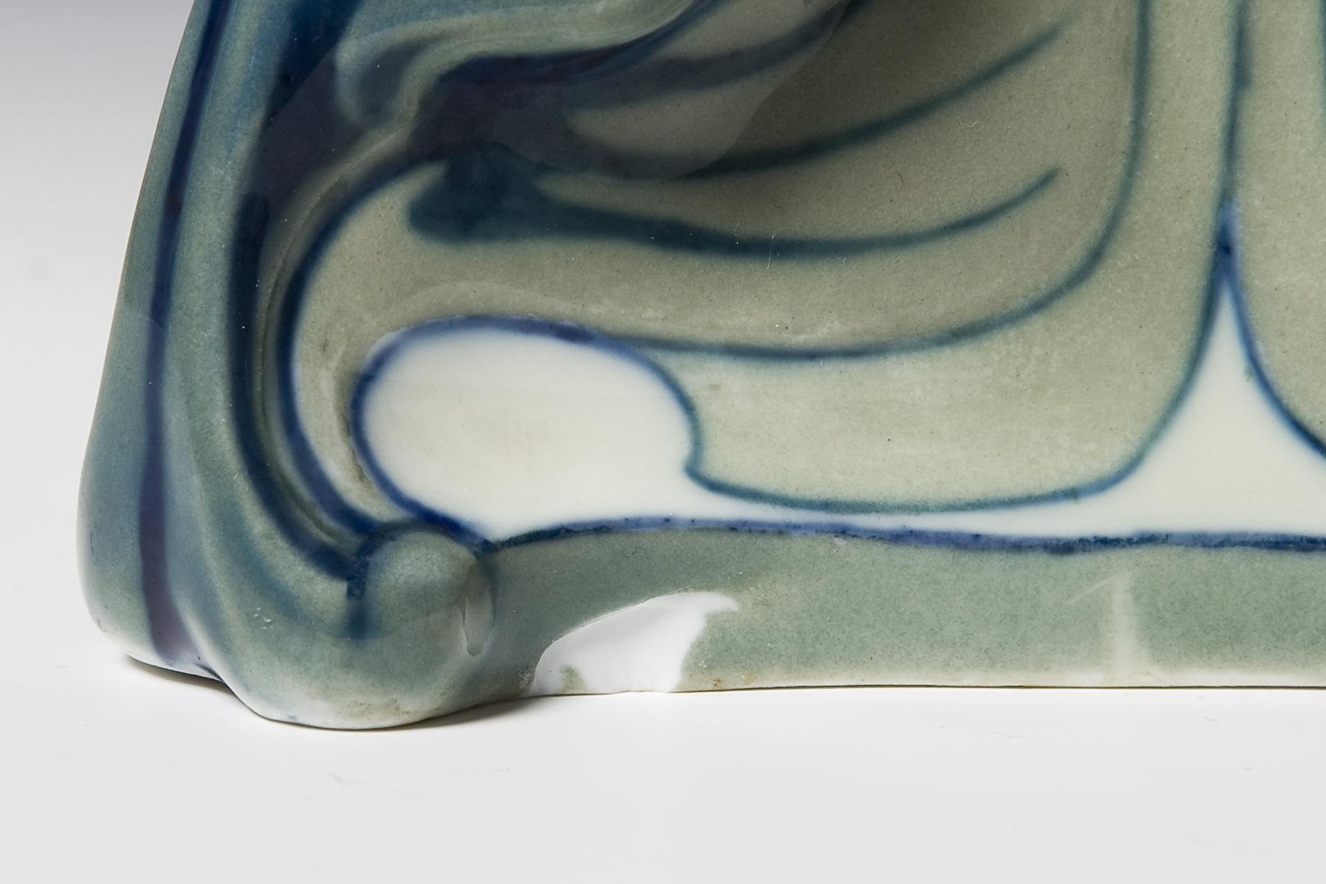 Model year: 1904, all-round stylized floral relief decoration, coloured underglaze painting, unglazed base, incised mark, sword mark. Base slightly bumped, small firing crack in the lower part, firing crack in the inner base.