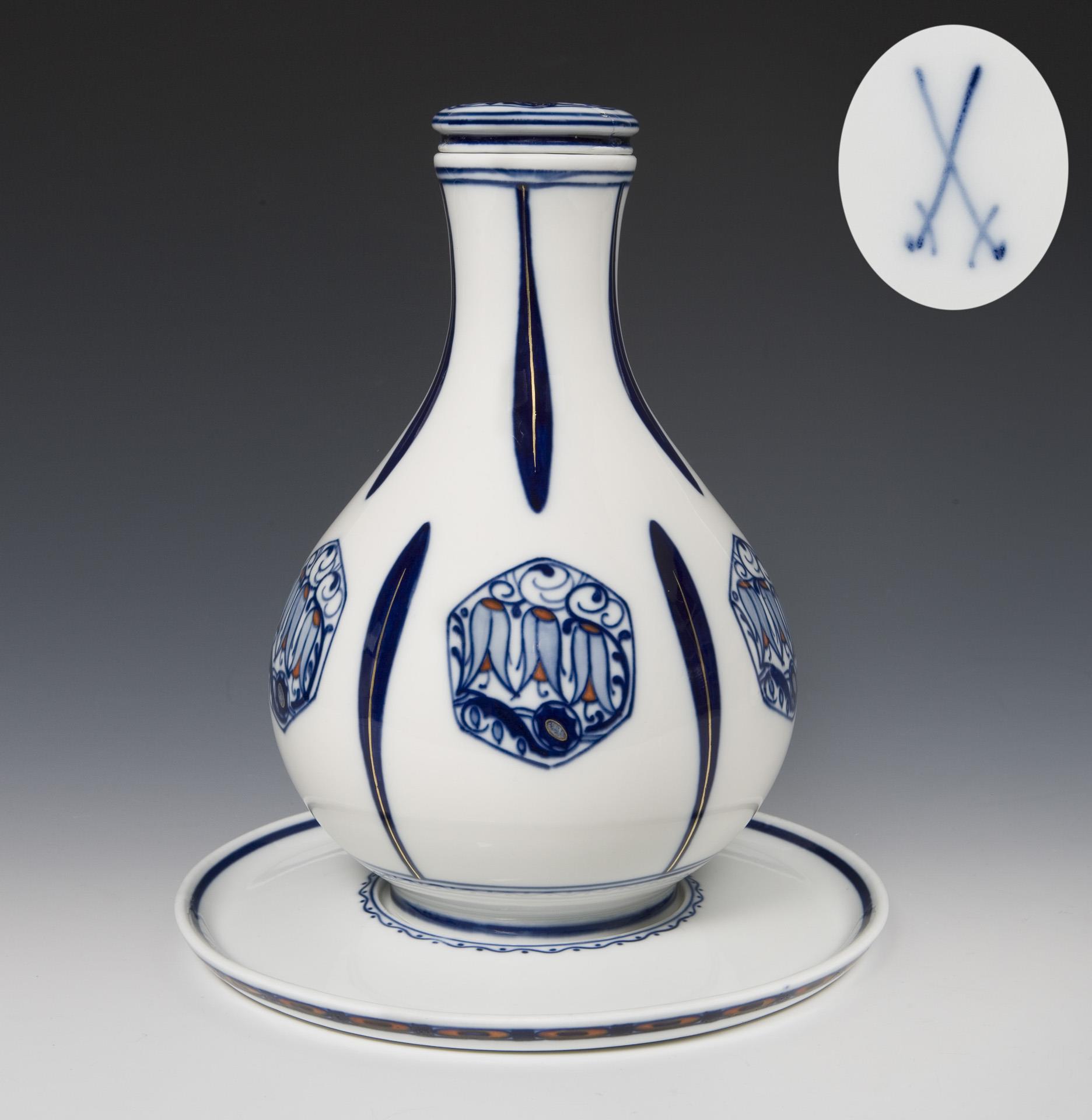 Art Nouveau water bottle with stopper, saucer. Meissen.