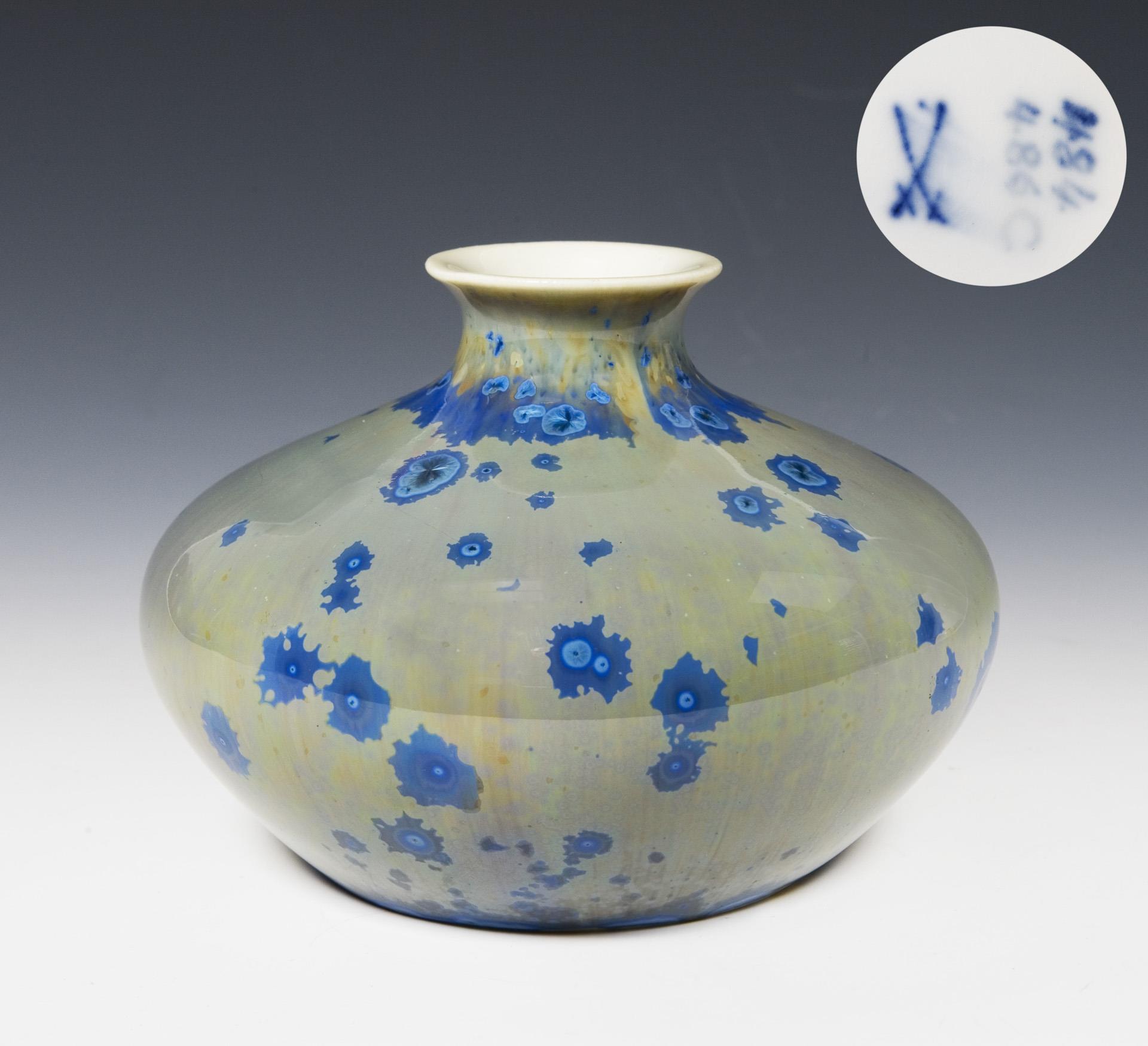 Mold model by Erich Hösel and co-workers, model year: 1900. Floated olive green glaze with azure blue single crystals. Incised mark, press mark, painter's mark, sword mark with dot. Fine glaze crack on the wall.