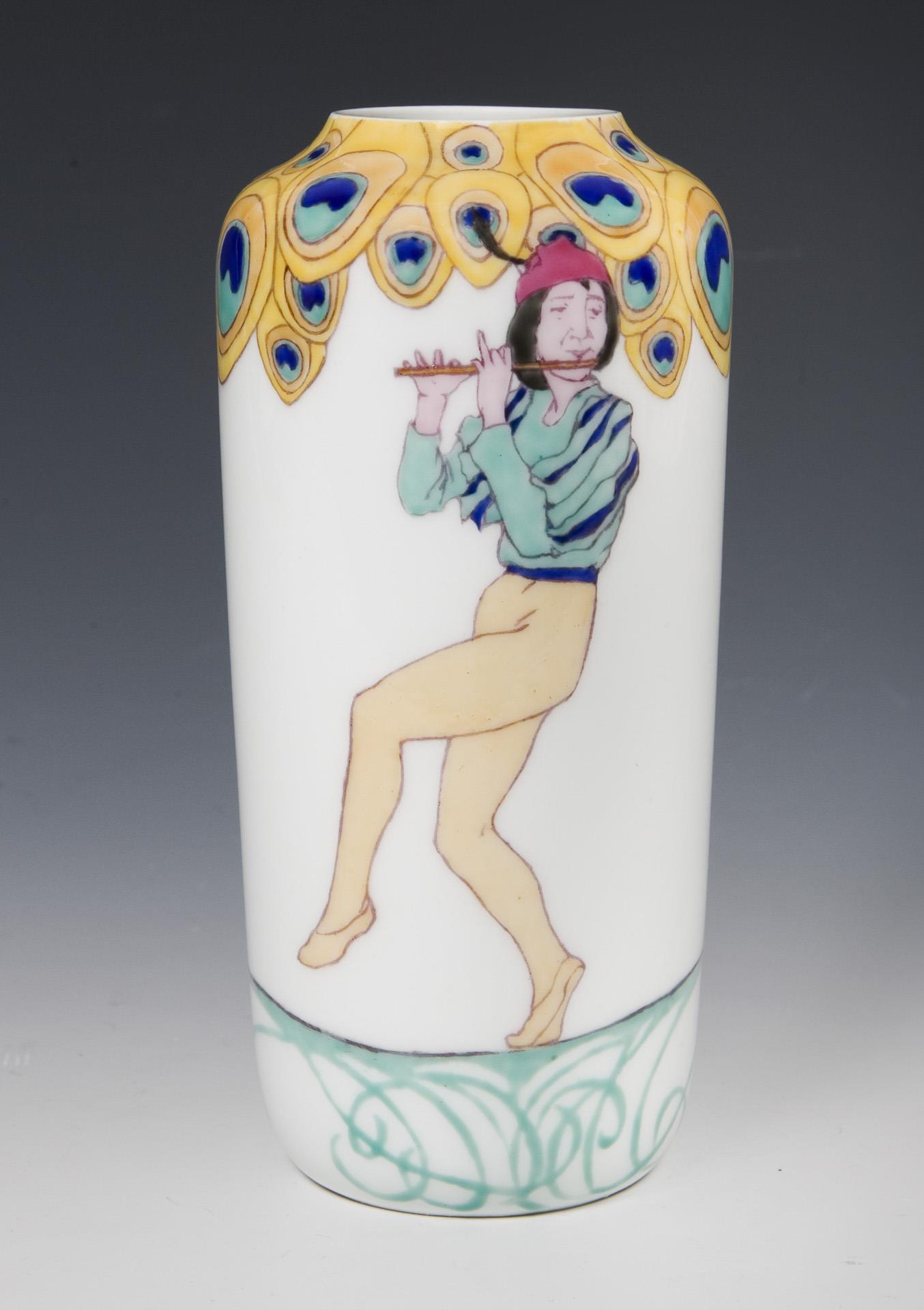 Shaped model by Theodor Grust, model year: 1902-1904, all-round coloured mass painting with dancing couple and flute player, stylized peacock eye decoration on the rim. Unglazed base, incised mark, impressed mark, sword mark.