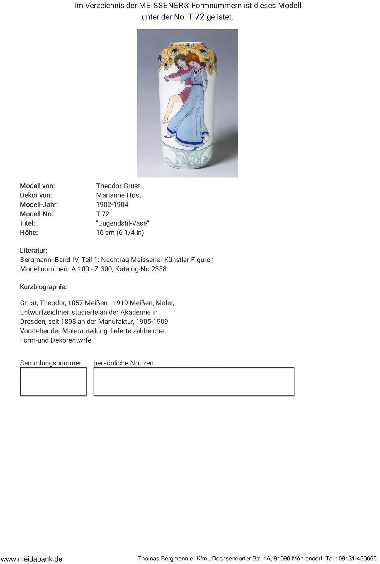 Grust, painter, draughtsman, studied at the academy in Dresden. From 1898 at the Meissen manufactory, 1905-1909 head of the painting department, provided numerous designs for shapes and decorations * Partner auction Bergmann.