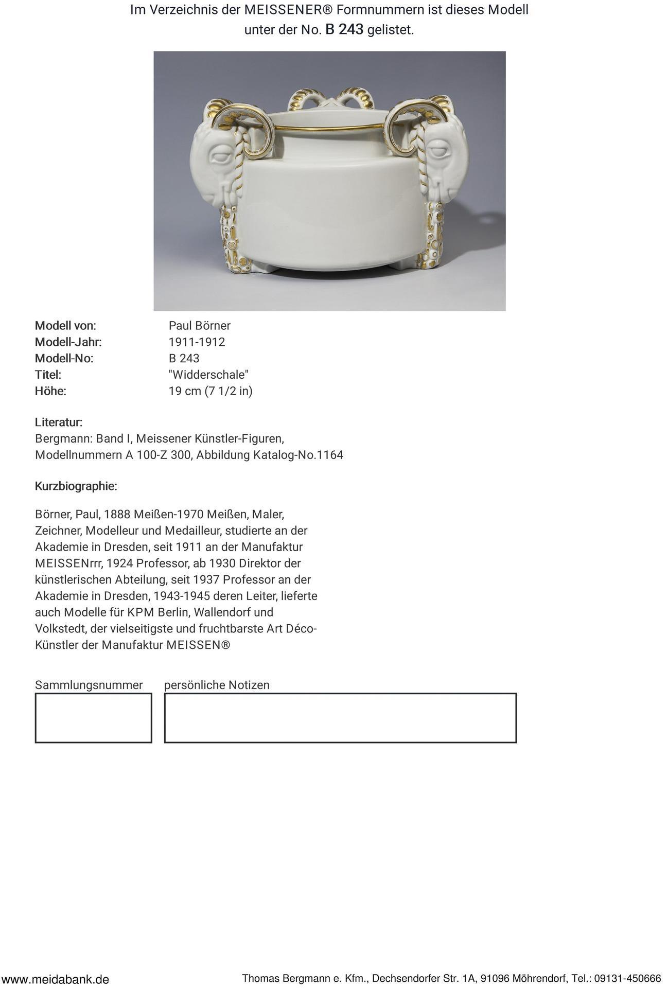 Börner, painter, draughtsman, modeller, medallist, studied at the academy in Dresden. From 1911 at the Meissen manufactory, from 1930 director of the art department. Professor at the academy in Dresden from 1937 * Partner auction Bergmann.