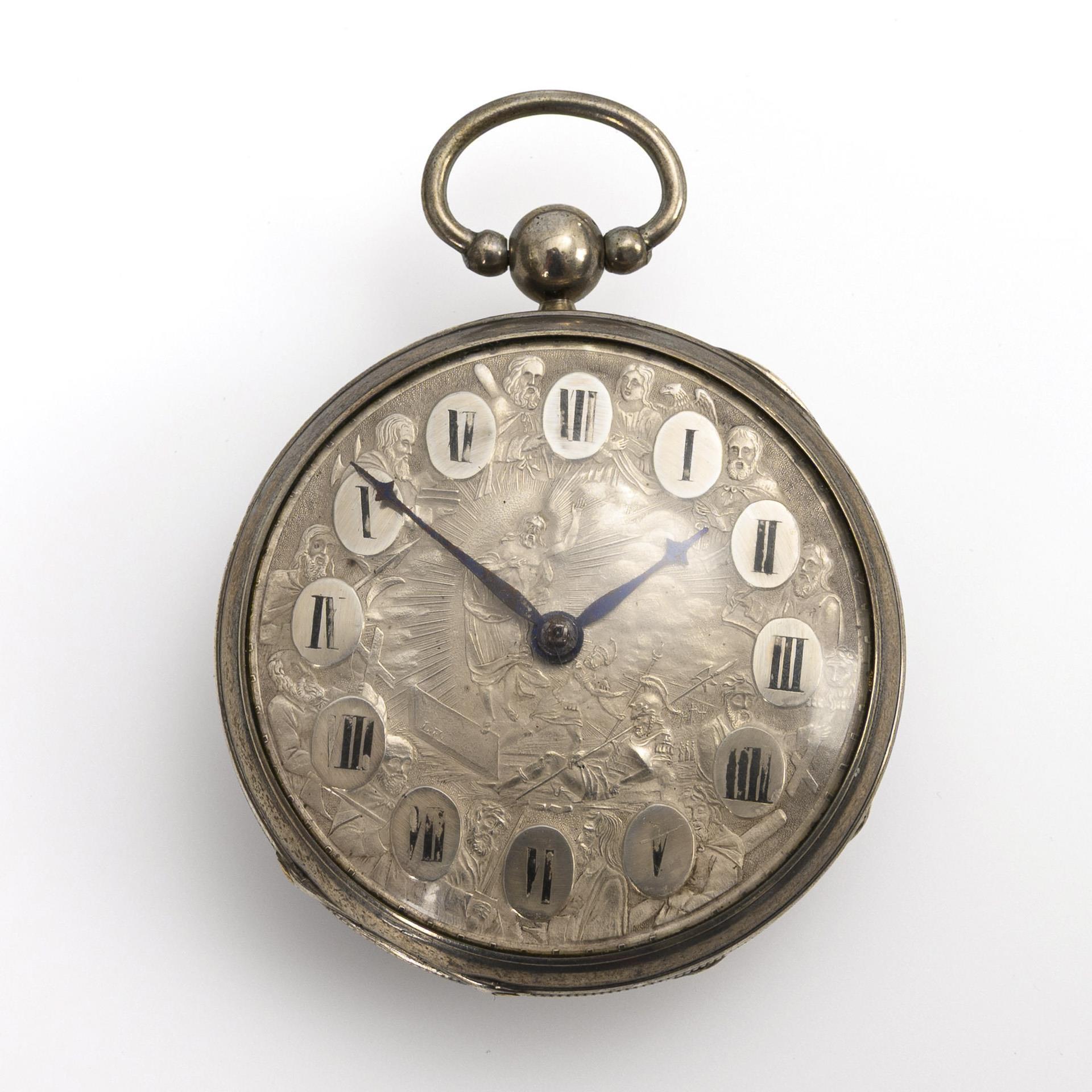 Silver pocket watch with ornate relief dial with apostles.