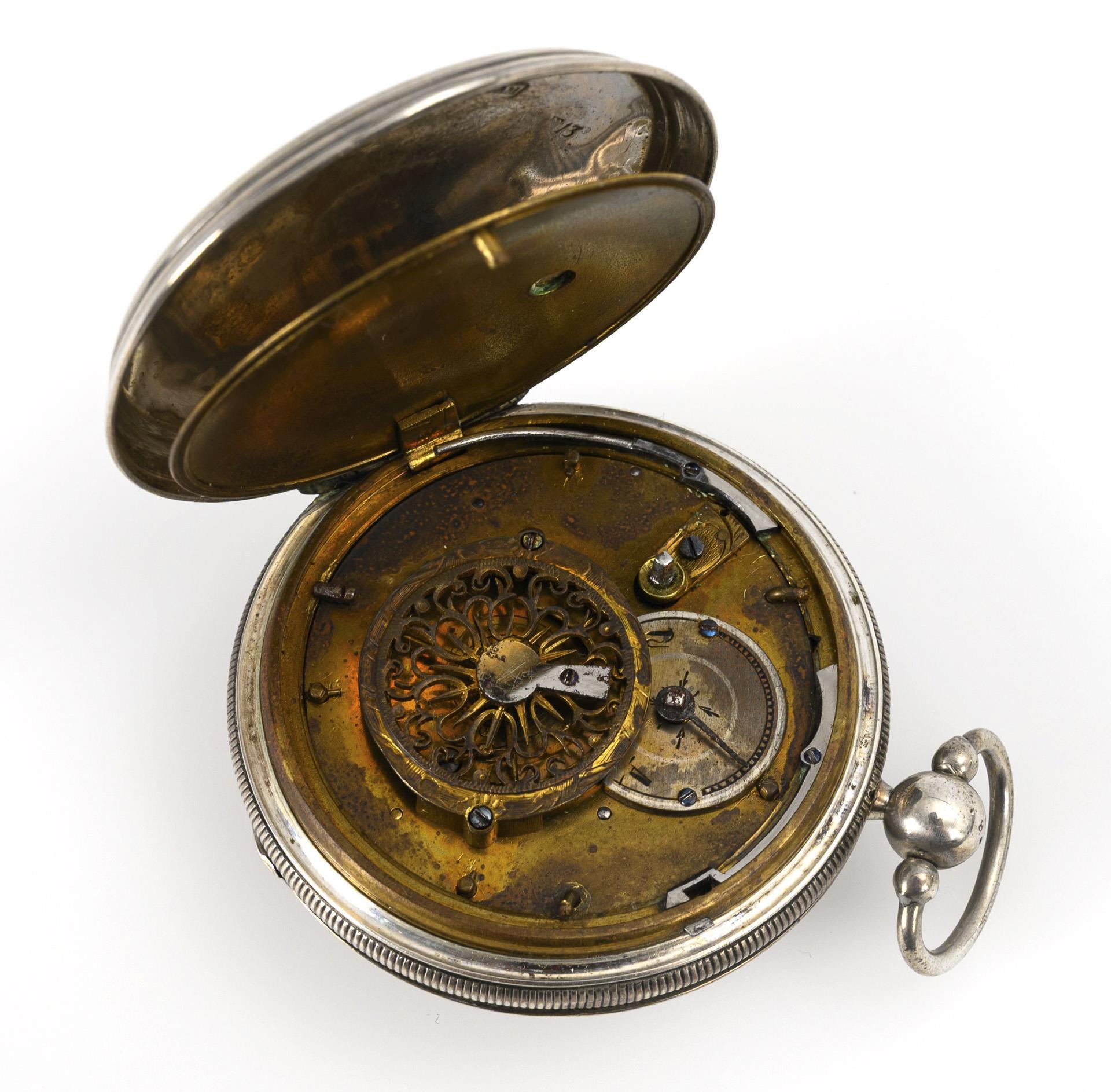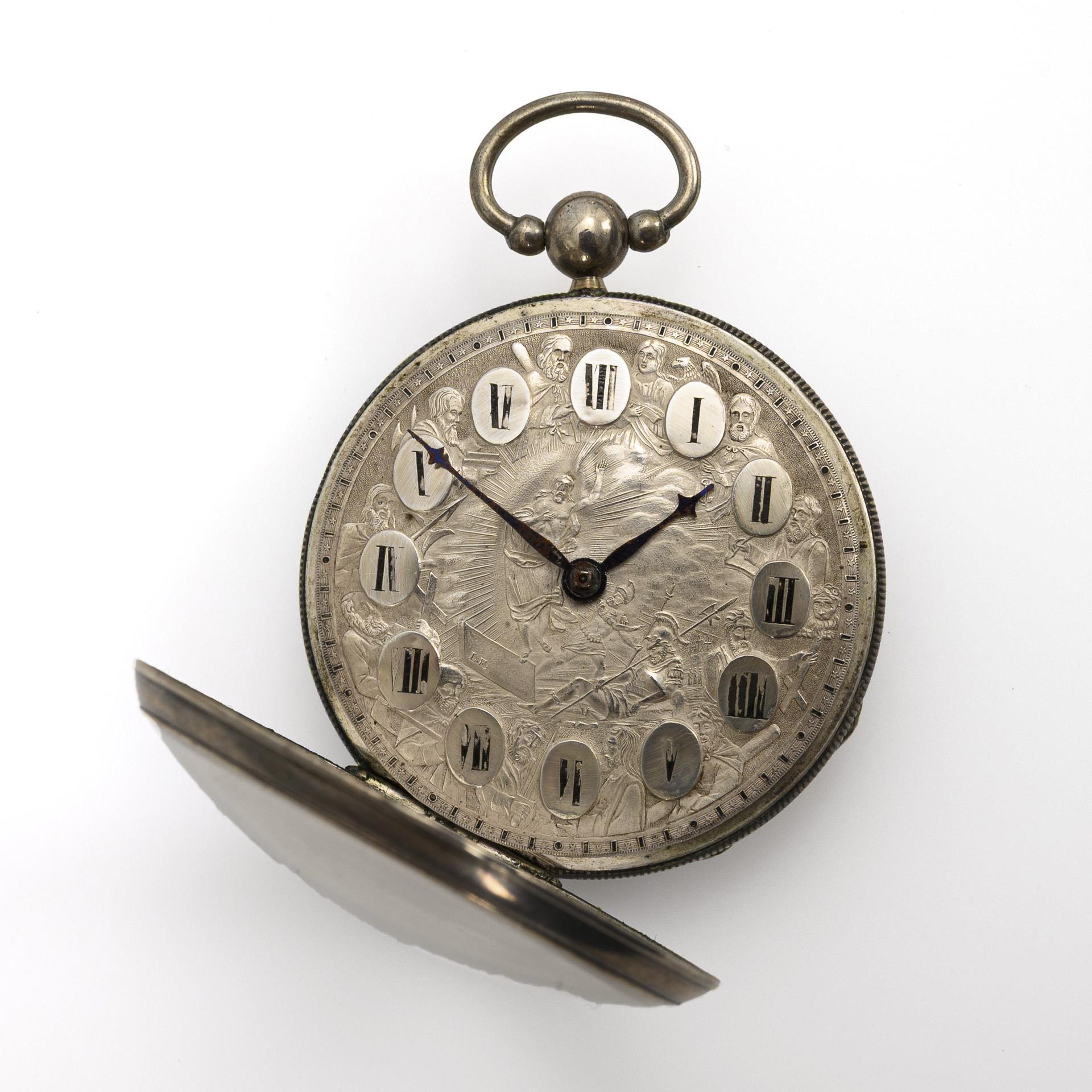 Brass full plate movement with florally pierced balance bridge and keywind. Runs short. Silver relief dial with Christ figure, the 12 apostles and ancient warriors with spears, oval reserves with Roman numerals, minute ring, blued spear hands.