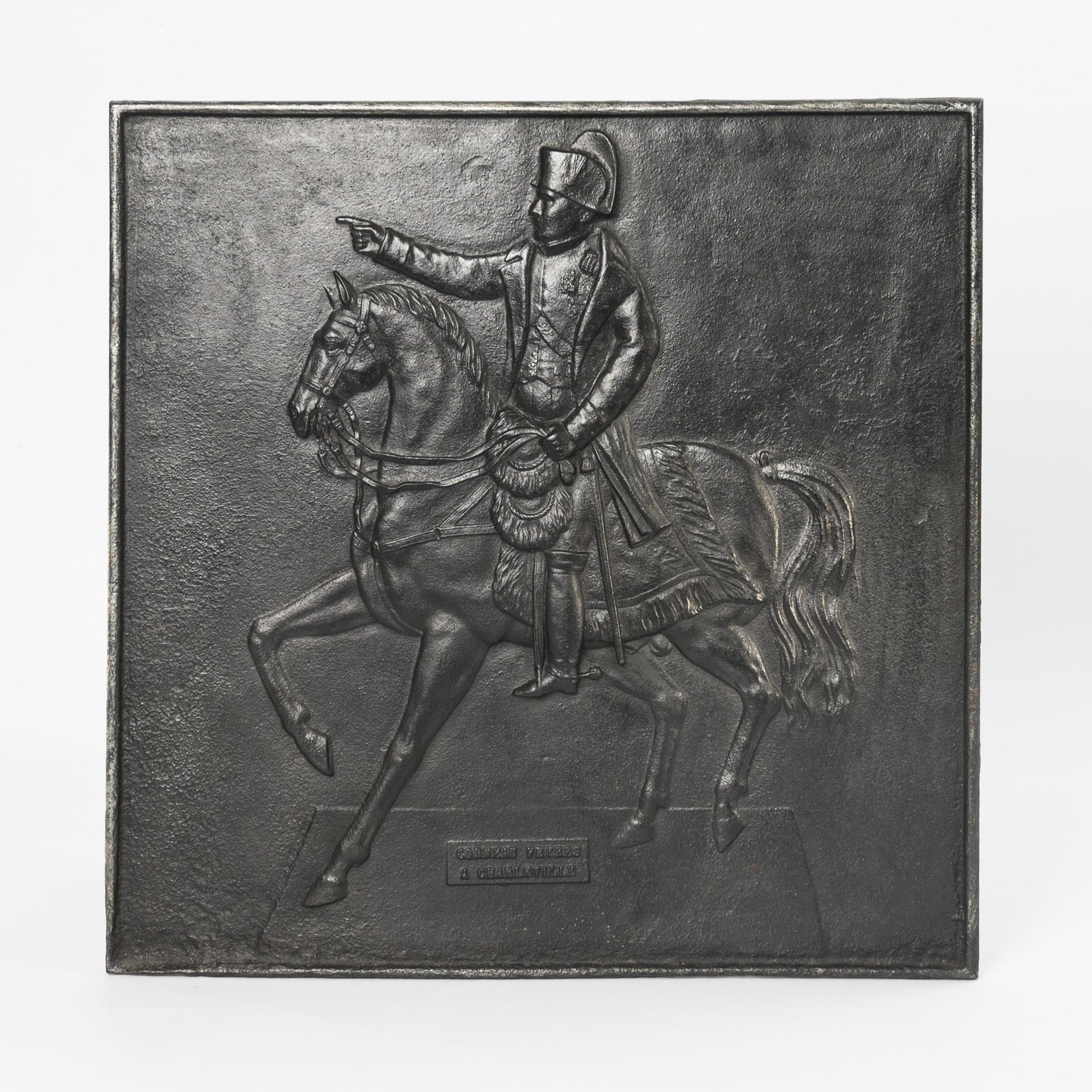 Emperor of the French in uniform riding on a stallion, pointing ahead in a commanding pose. Partly rusted (equestrian figure not affected).