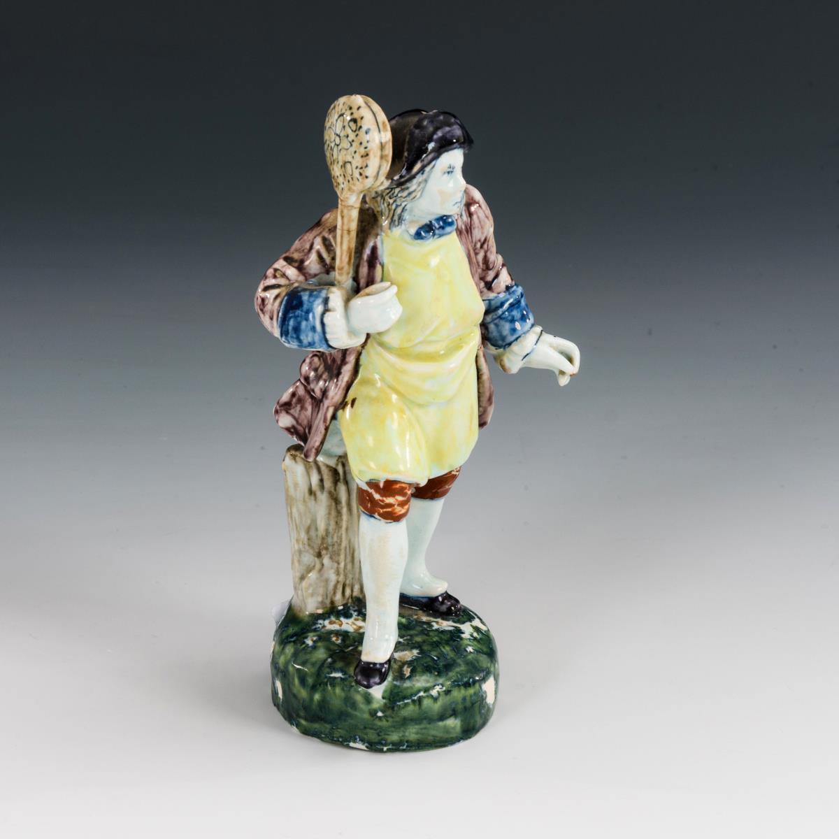Fayence-Figur: Mann mit Waffeleisen auf grünem Rundsockel.