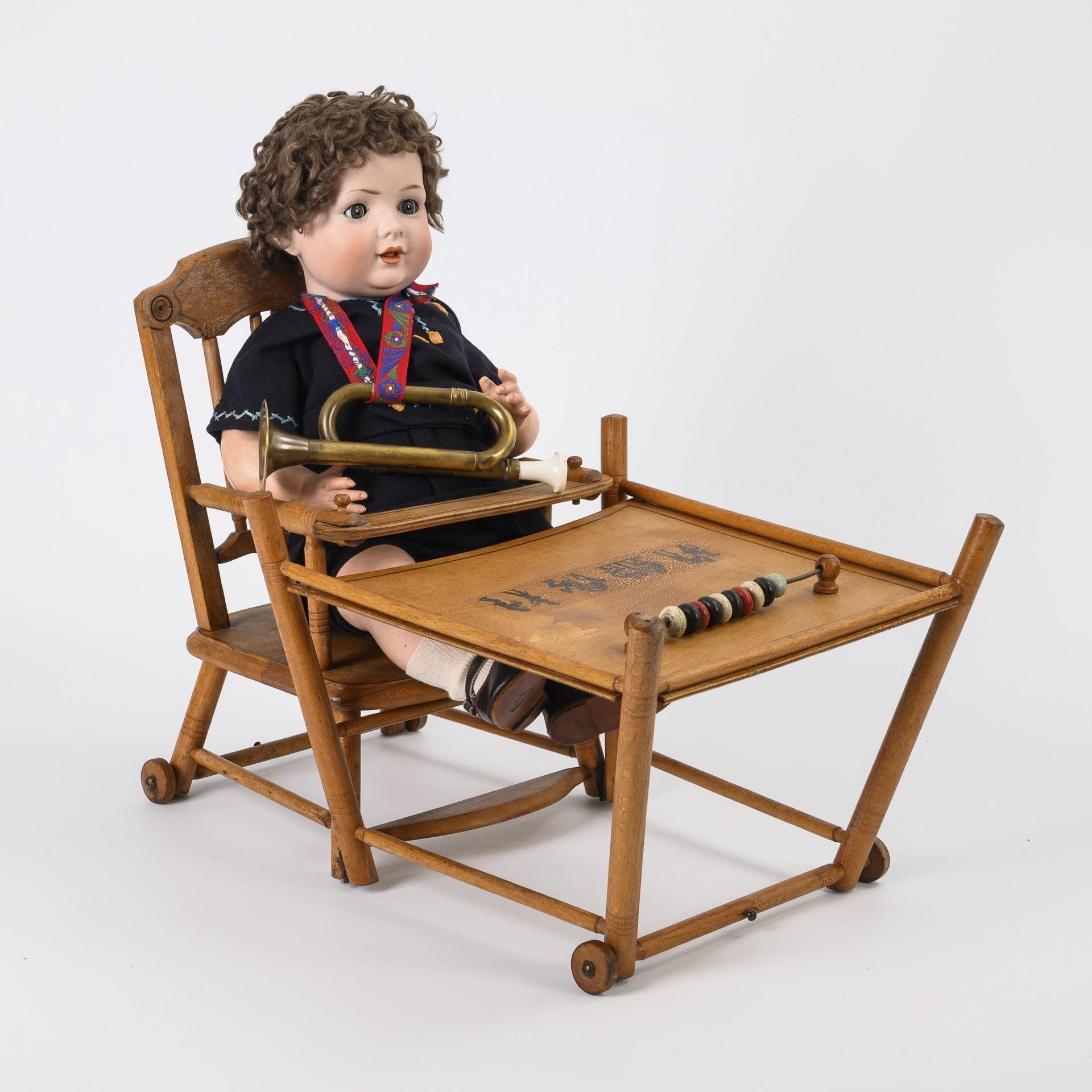 Cranked head, blue sleeping eyes, short curly mohair wig, 5-part sitting baby body, dark blue wool clothing with embroidery, black leather shoes, with trumpet. L 50 cm / Folding high chair (with table: 35.5 x 51 x 31.5 cm), total height: 59 cm. Wig firm: head not x-rayed, but no defects visible. Some fingers chipped.