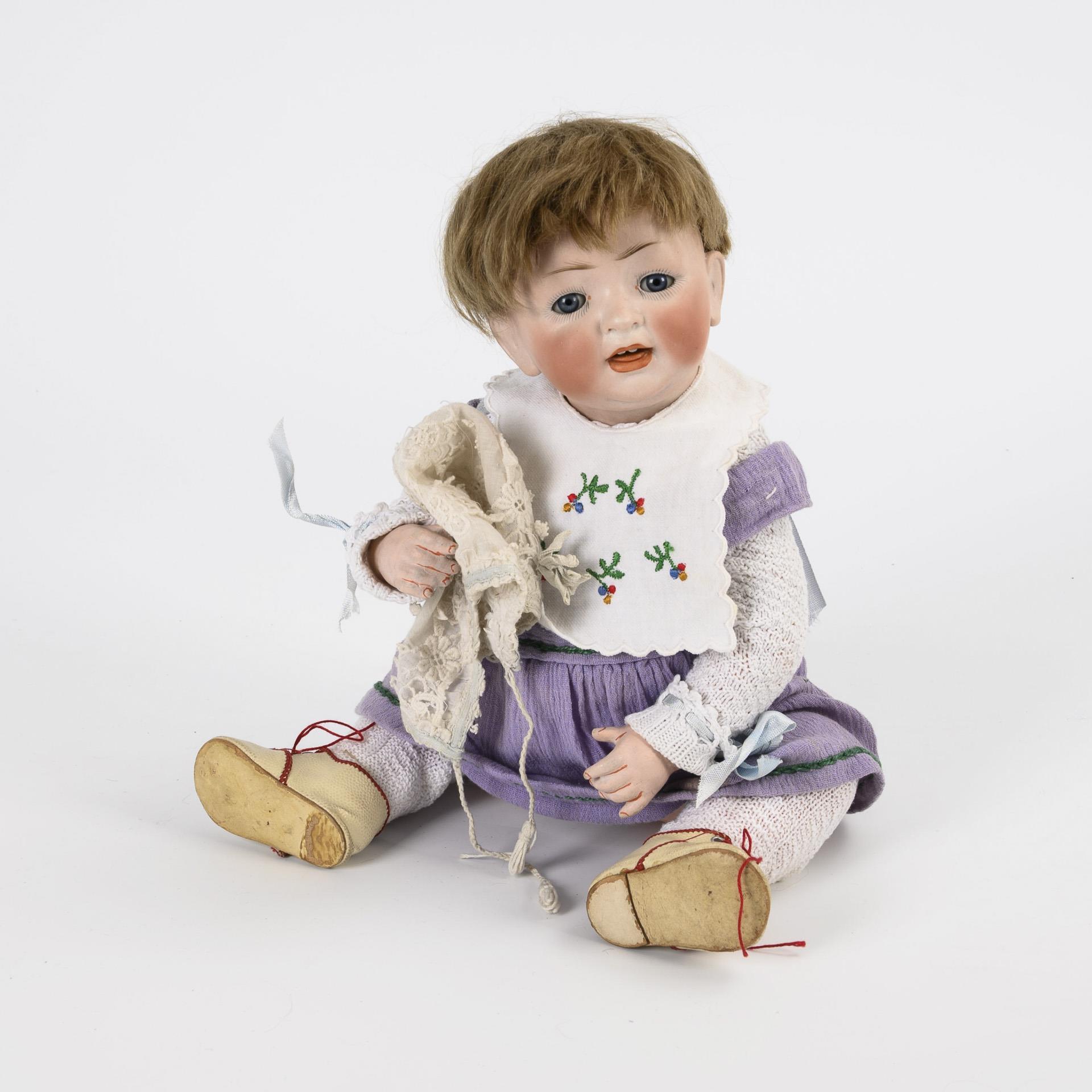 Cranked head, blue sleeping eyes, open mouth with molded tongue, dark blond mohair wig. 5-part sitting baby body made of mass. Purple dress, bib, white oilcloth shoes. Wig fixed: head not x-rayed, but no defects visible. Hands lightly touched up.
