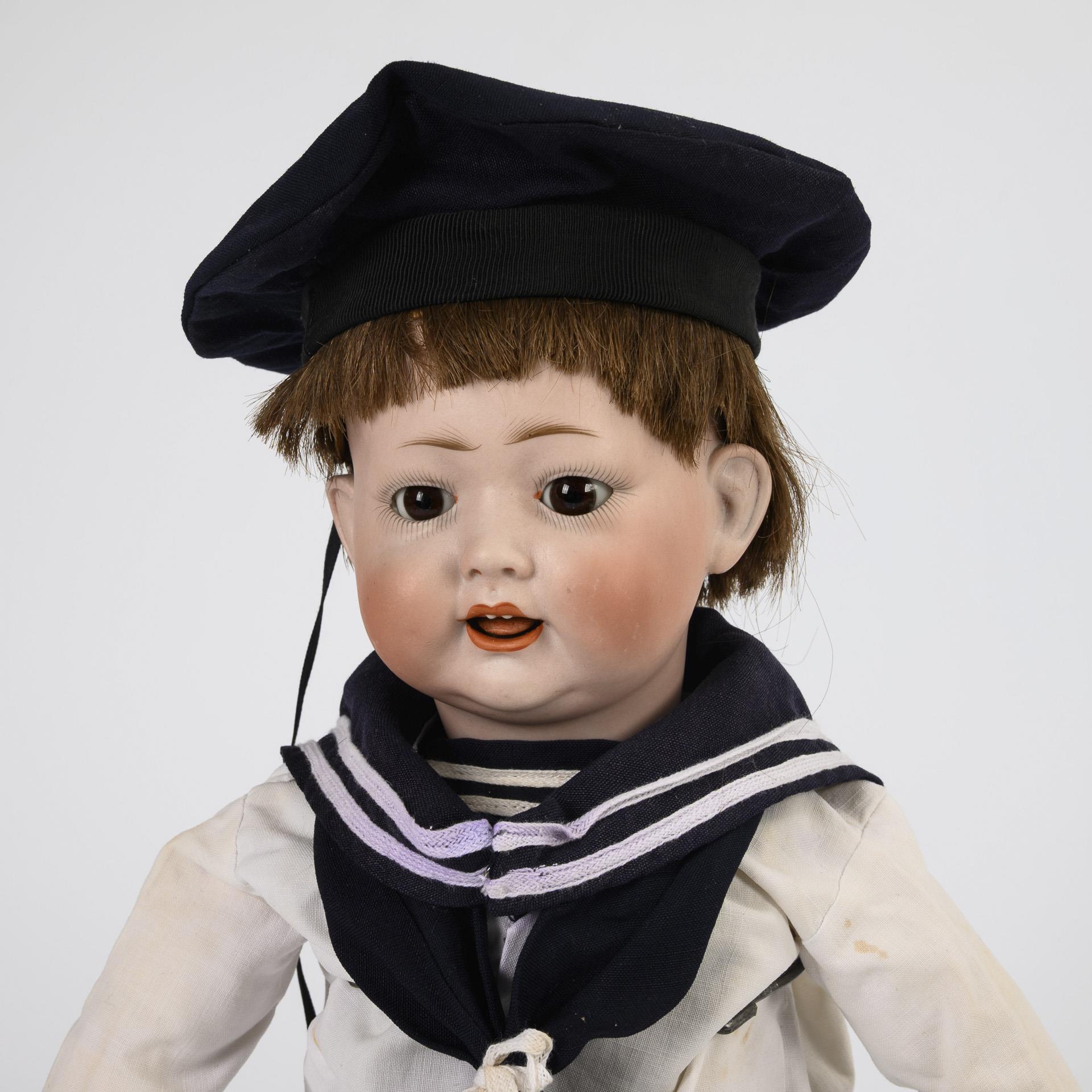 Cranked head, blue sleepy eyes, open/closed mouth with modeled tongue and 2 painted teeth. 15-part toddler body. Sewn blue and white suit, cap, brown leather shoes. Wig fixed: head not x-rayed, but without visible defects.