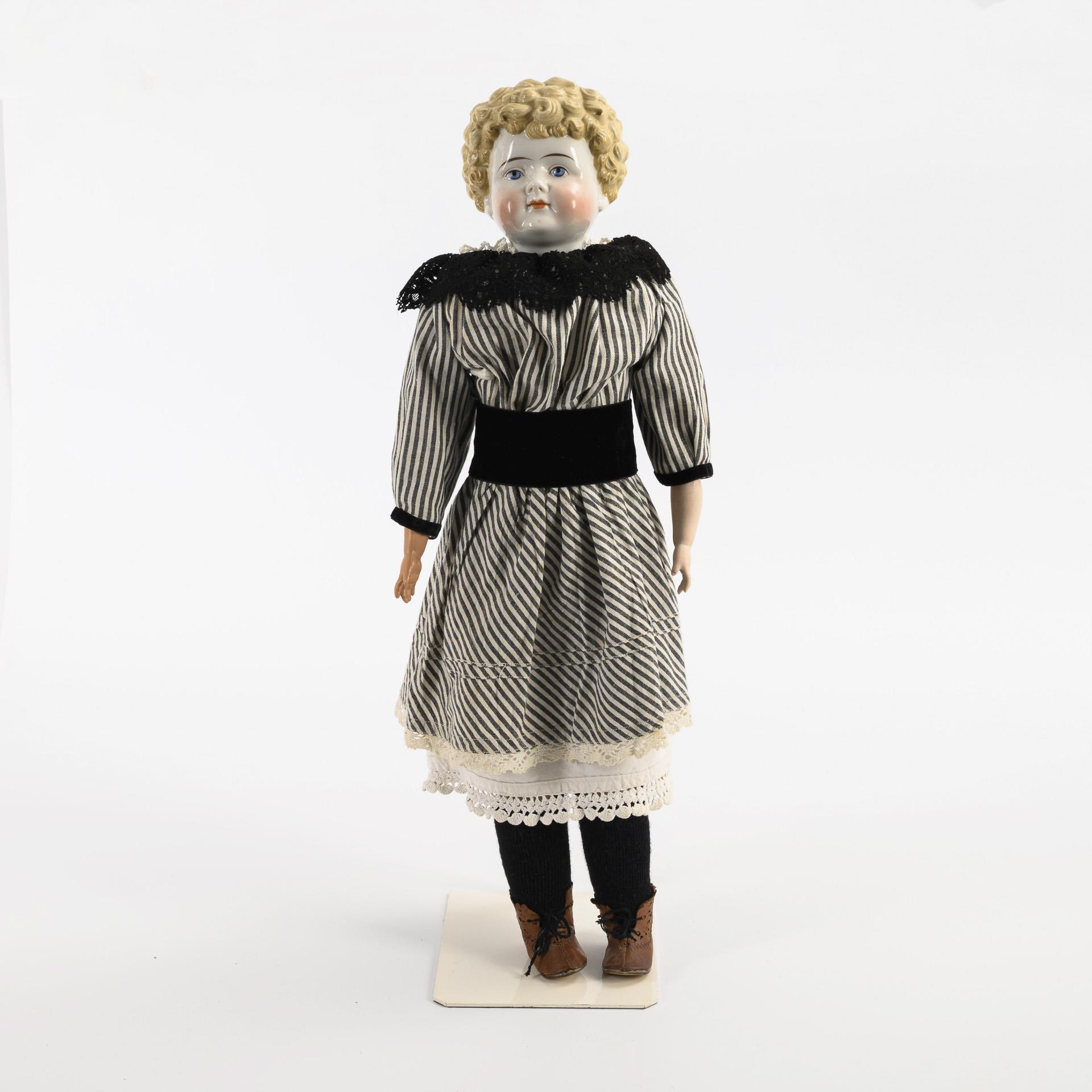 Glazed head with painted blue eyes and sculpted blond hair. White leather body with one bisque and one celluloid arm. Striped dress with black velvet belt, old brown leather shoes. Body with signs of age.