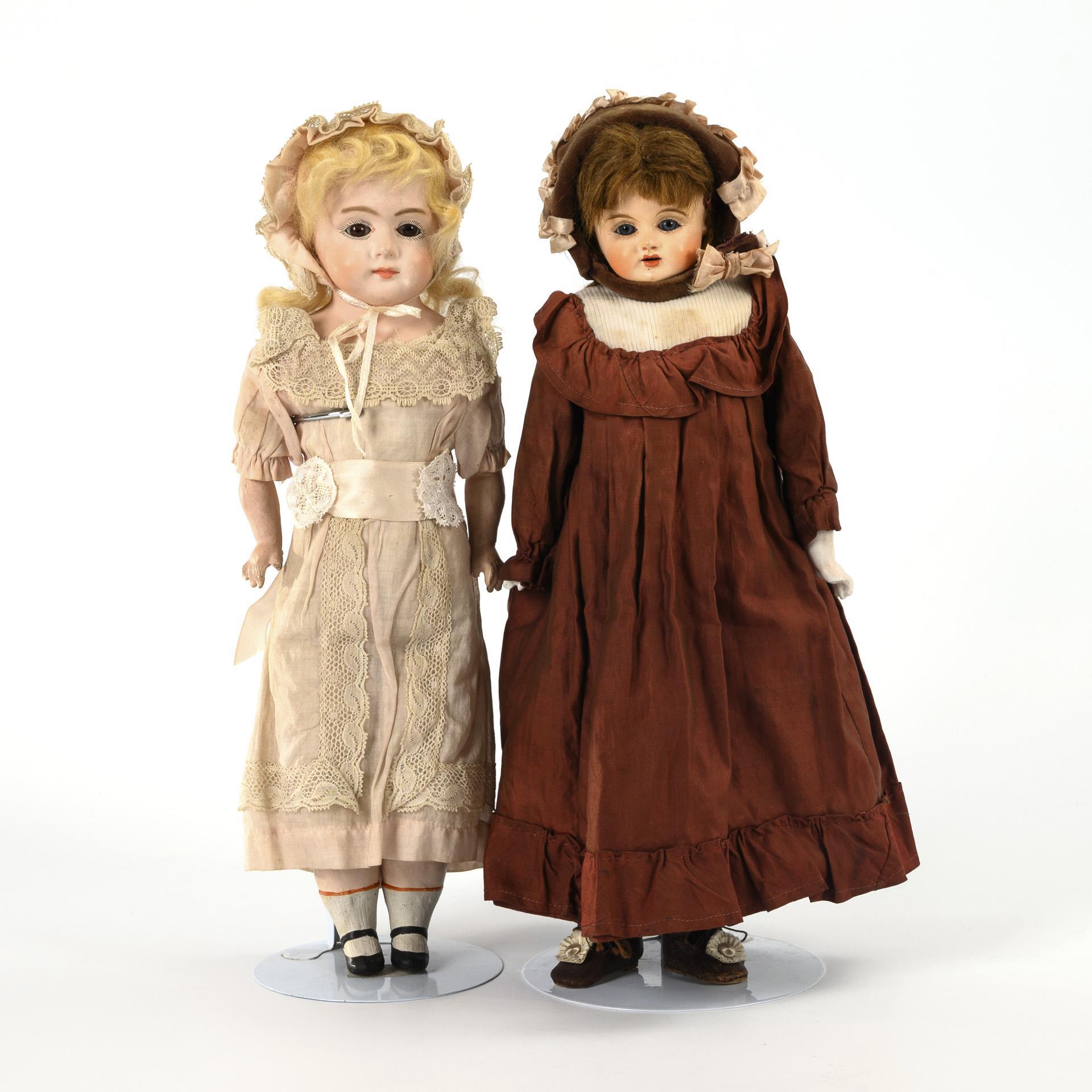 Both with mass chest head, fixed glass eyes and mohair wig. 1x with leather body, defective porcelain forearms and rust-red dress, 1x with fabric body, mass limbs, modeled shoes and pale pink dress.