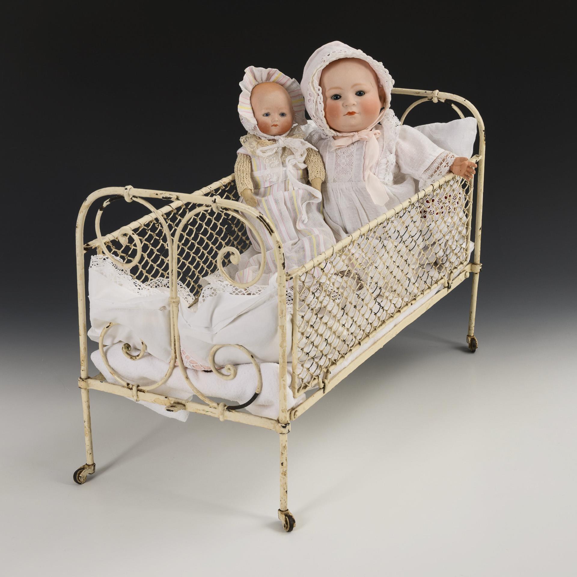 Heubach baby (339), type newborn with binding head, "American" fabric body and voice. L 39 cm. / Small AM doll "Baby Phyllis" with new fabric body, for the American market. L 26 cm. Both in light-colored dresses, with bonnet. / White painted wire bed on small castors. 32.5 x 51 x 28 cm. 1x celluloid hand with glued fingers, bed with small paint defects.