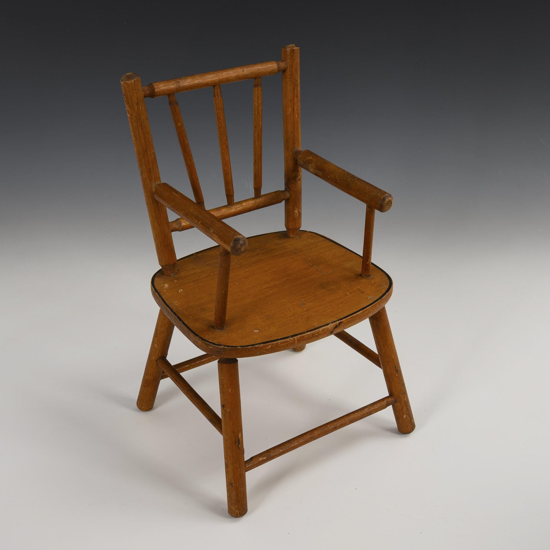 Probably by the Kister company, Scheibe. Deeply lowered chest, painted blue eyes, modeled blond hair with elaborate braided hairstyle. Leather body with bisque forearms. Red striped dress with lace collar, coral necklace, younger leather shoes. With wooden chair (35 x 22 x 20 cm) and small white chest head of the same type (H 3 cm). 1 leg made of fabric replaced, 2 fingers on the right defective.