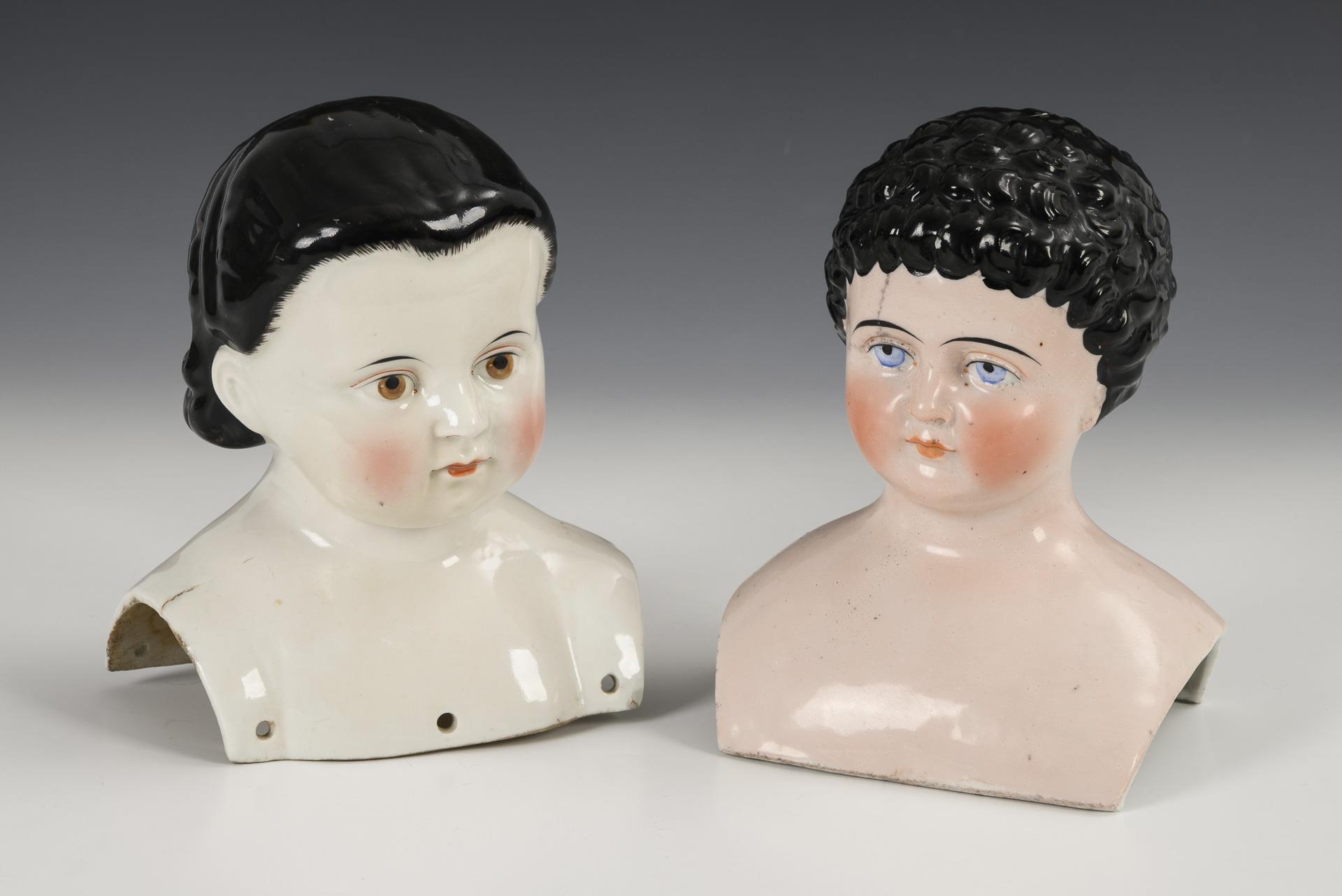 2 large, glazed breast heads: 1x white, type "Alice in Wonderland" with brown eyes and modeled hairband. 2 firing cracks, 1 small chip. H 19 cm. / 1x pink tinted with blue eyes and curly hair. Hair cracked. H 18 cm.
