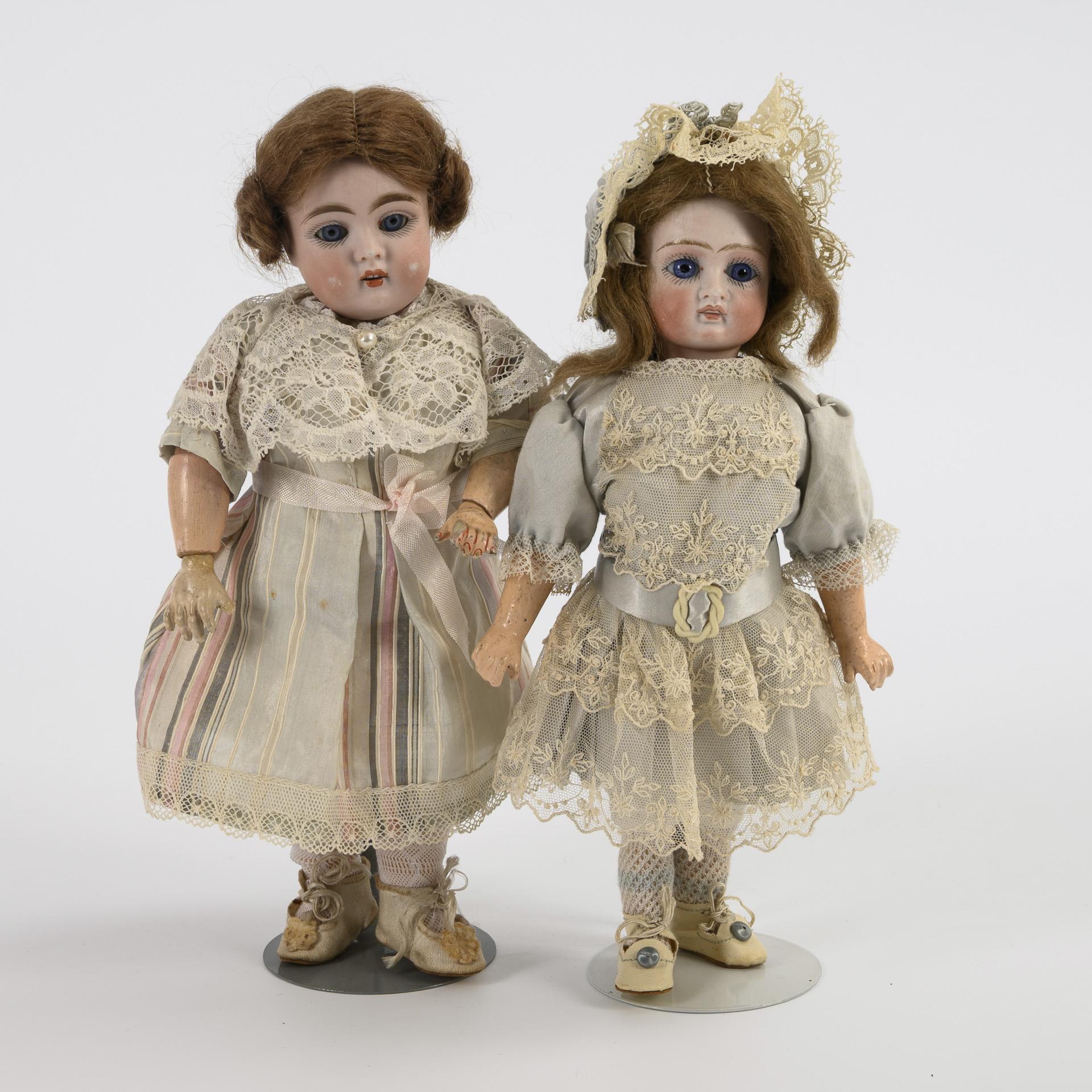 Both with crank head, blue glass eyes, mohair wig, jointed body, light dress with lace and white shoes. 1x Kestner (155 marked) with snail hairstyle. 1 hand added. L 28 cm. / 1x with early, high-necked head and fixed paperweight eyes, body with gloved arms. L 26 cm. Wigs fixed: heads not x-rayed.
