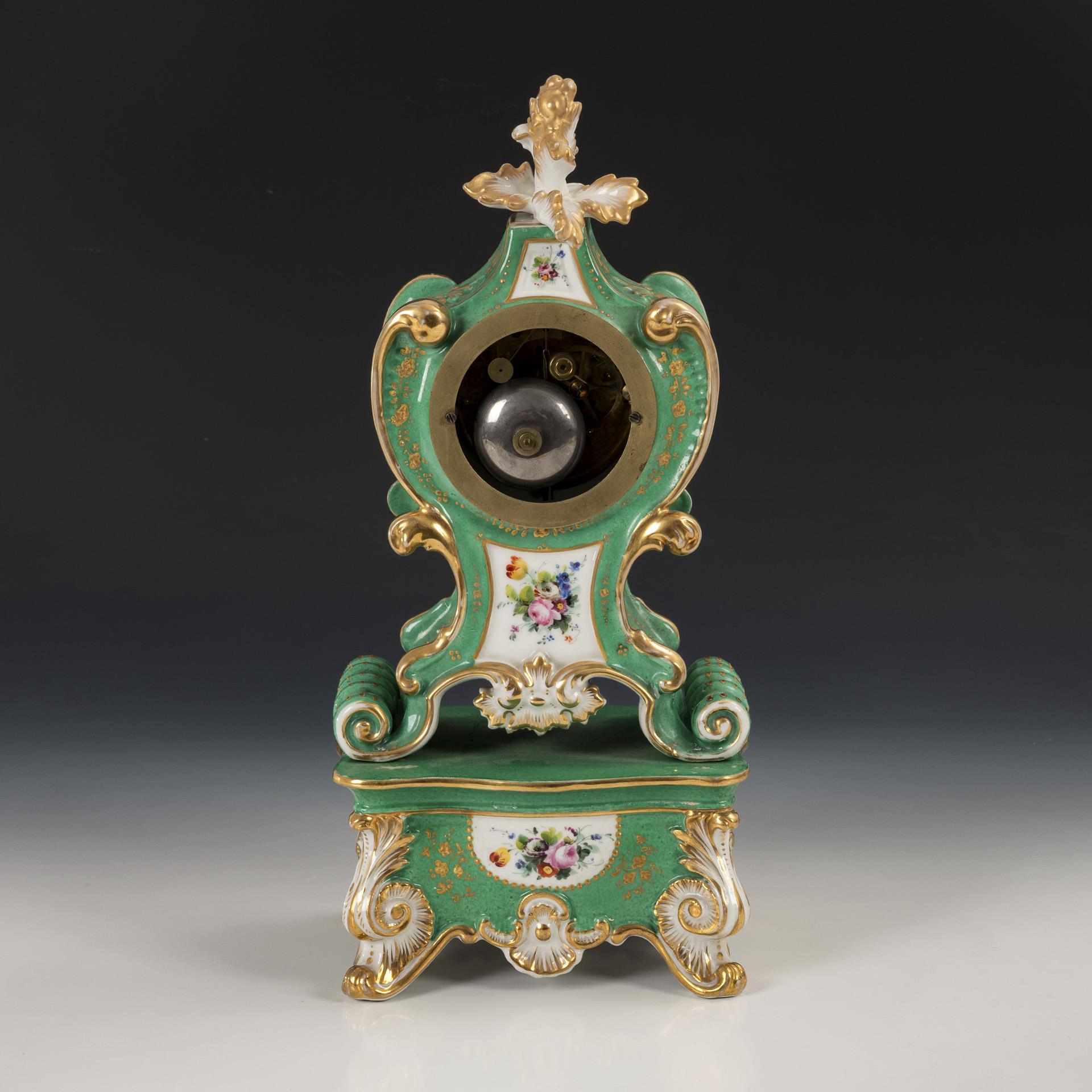 Rocaille body on a four-legged, rocaille-relief base, inset finial. Green background with polychrome flower painting in cartouches. Inset movement with enamel dial, Roman numerals and half-hour strike on bell (starts). 1 key. Glued crown, partially rubbed.