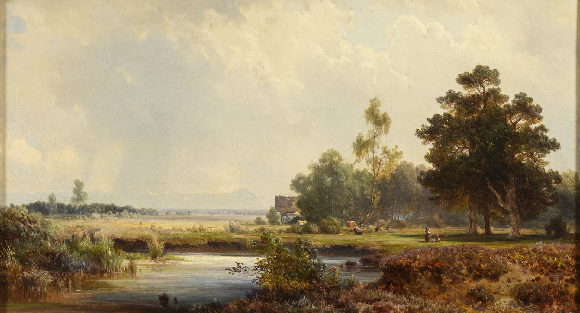 Flat area with lake shore and blooming heather near a house with cattle at the edge of the forest. Minimal traces of age.