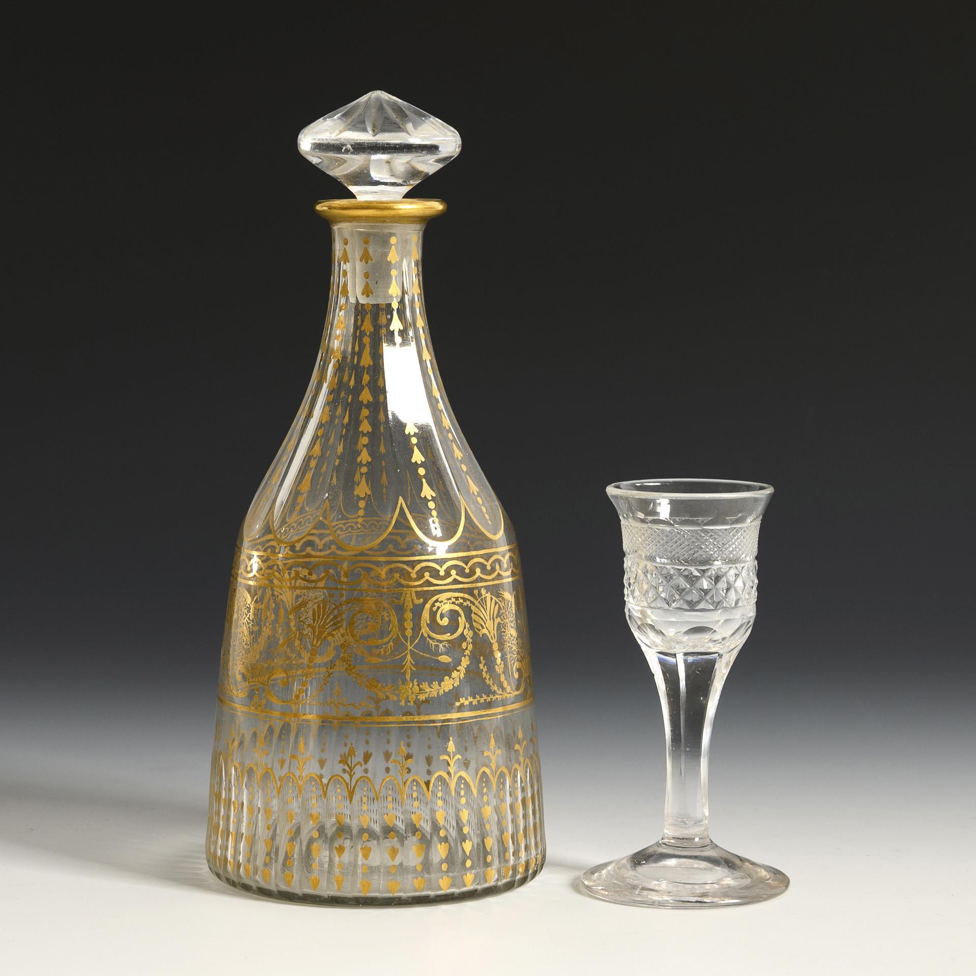 1x c. 1800: conical carafe with fluted stand, faceted neck and added stopper; fine gold floral painting / 1x 1st half of the 19th century.: Liqueur glass with stone-cut bell-shaped cuppa, faceted stem and round foot with rounded base.