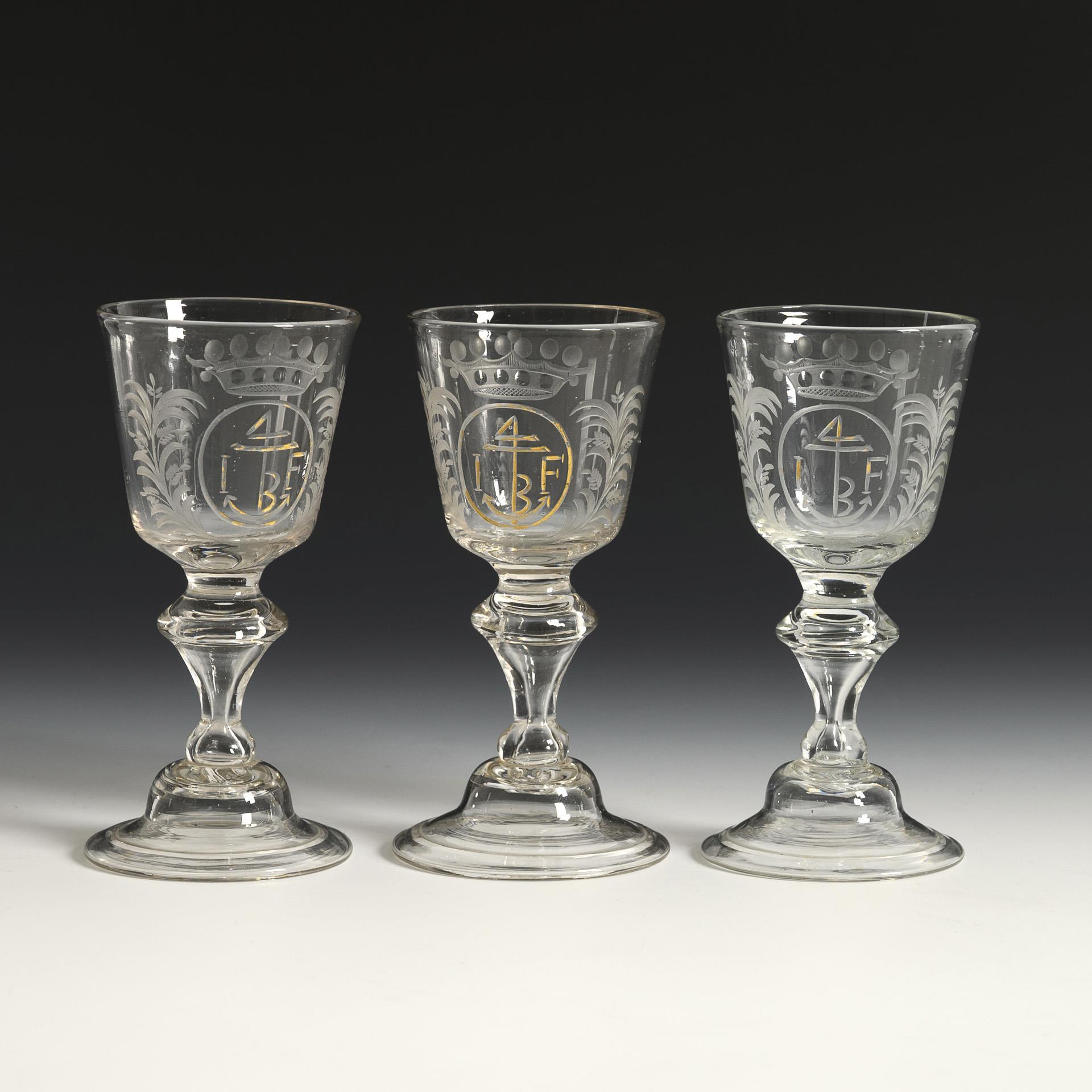 Conical bowl, hollowed baluster stem, hat foot with turned-down rim; pontil mark. On the front a crowned medallion flanked by palm fronds with the anchor monogram "IF". Rubbed gold.