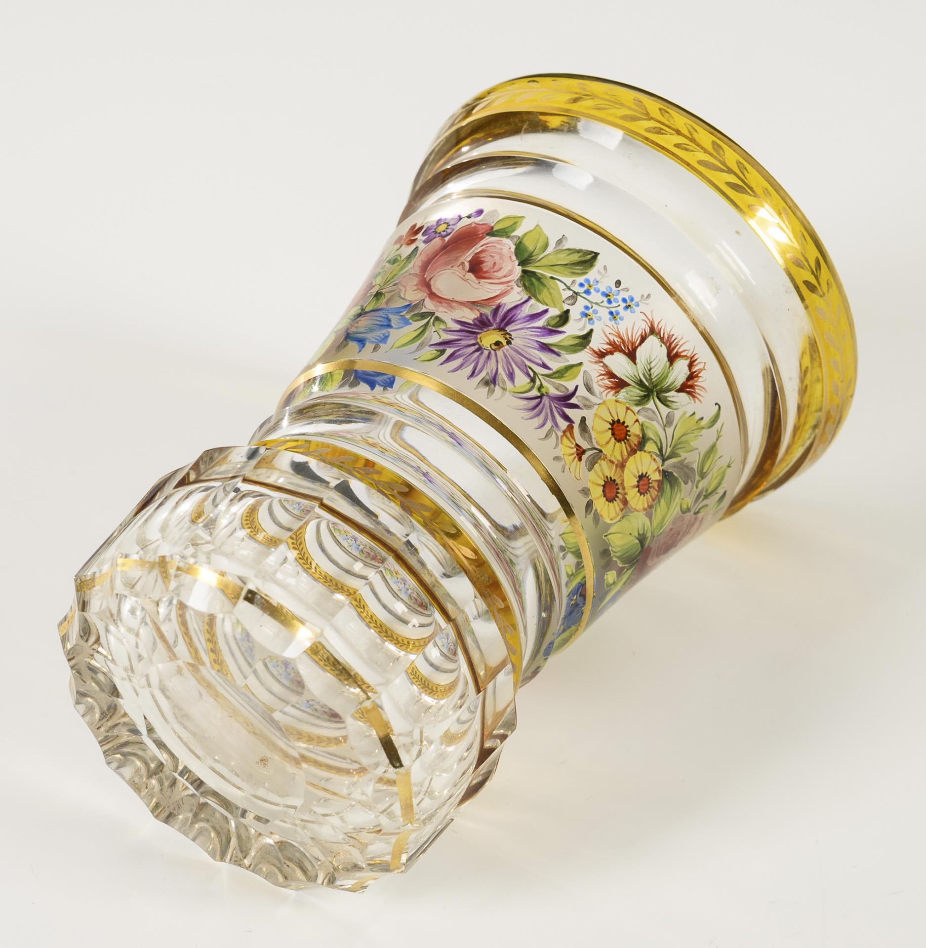 Conical beaker designed in the style of poppy jars with a solid, fluted base; dished rim. Between yellow borders with a golden leaf tendril, a circumferential polychrome enamel-painted floral band. Gold somewhat rubbed.