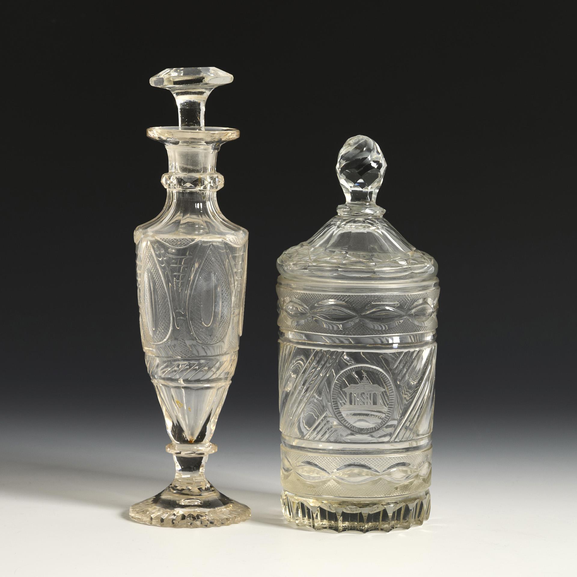 1x cylindrical beaker with rich notch and stone carving, on the front a medallion with an engraved architectural depiction above the inscription "Neubrunn", on the bottom the inscription "Andenken an Marienbad", with added knob lid. / 1x slender oval decanter with notch, steinel, facet and olive cut and stopper. Minimal chips to the base of the beaker, the rim of the lid and the stopper.
