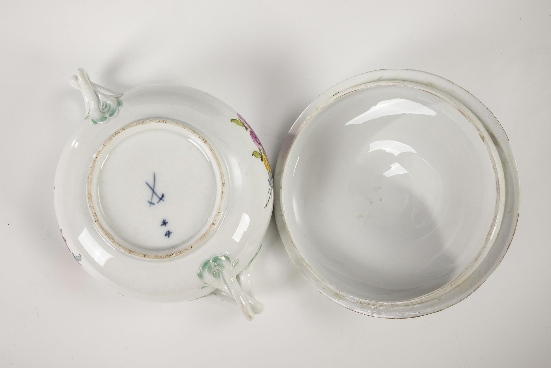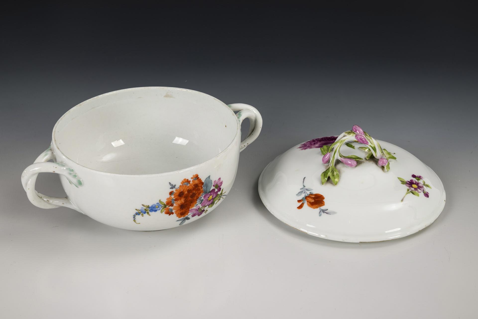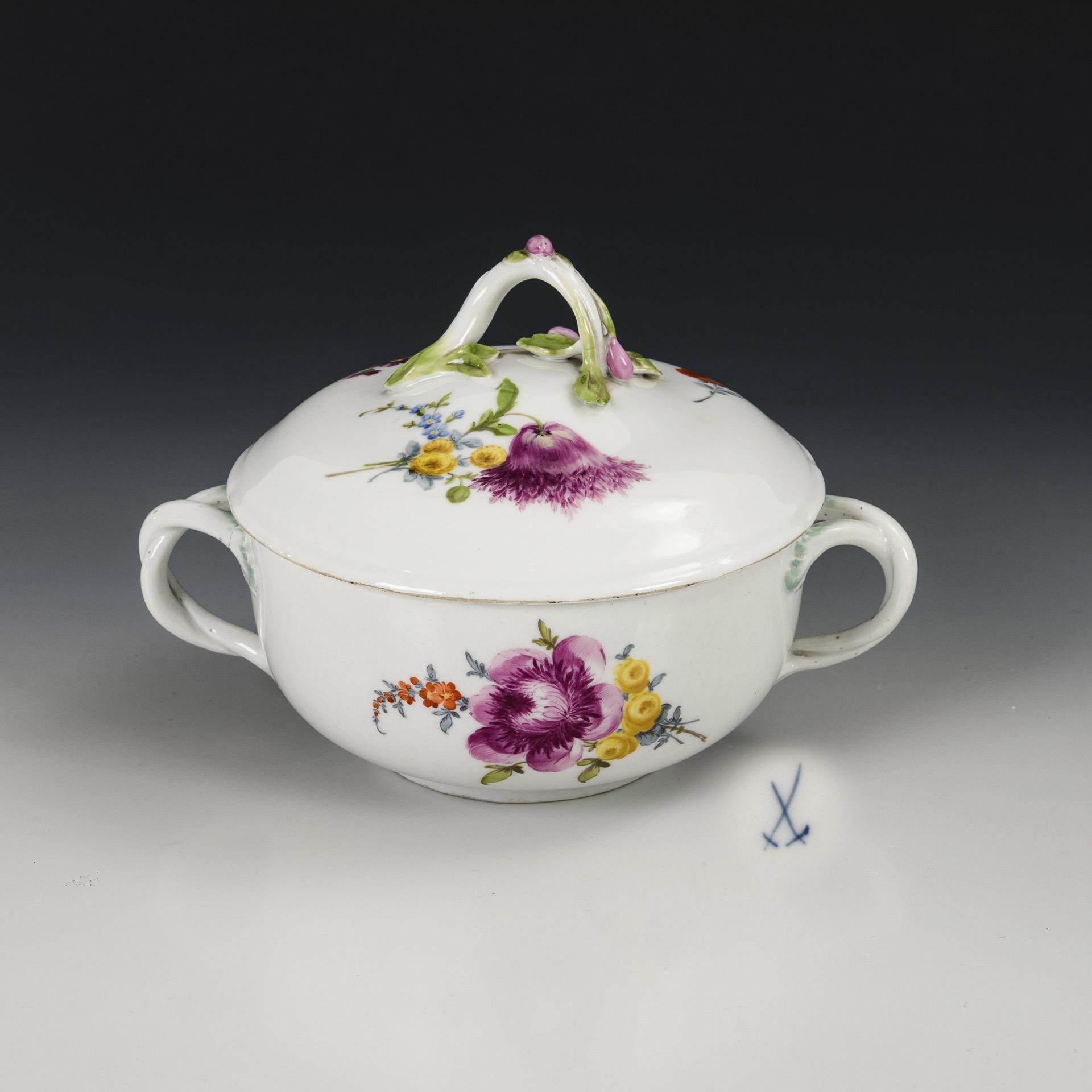 Bellied tureen with twisted handles and branch handle lid. Small firing crack in 1 handle.