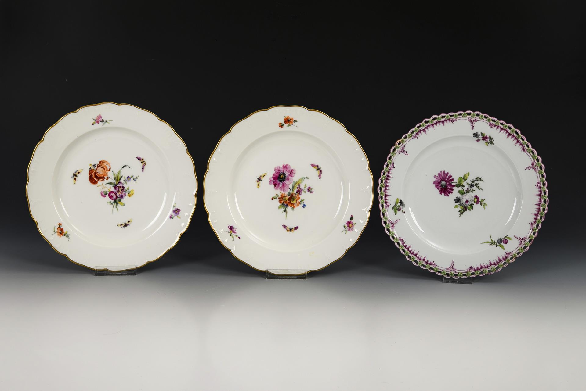 Model "Neuglatt". 1x around 1800: dessert plate with flower painting in purple, gray and green / 2x 1910: with polychrome flower and insect painting. Dessert plate with 2 rim restorations.