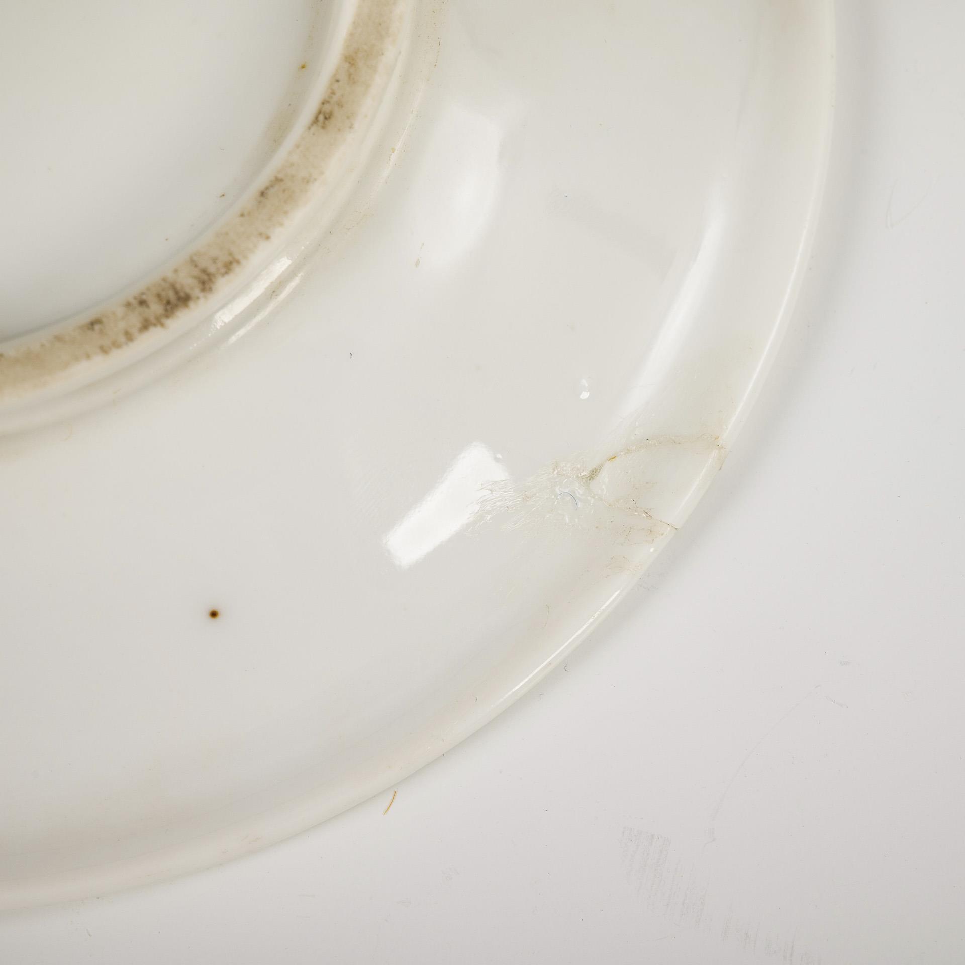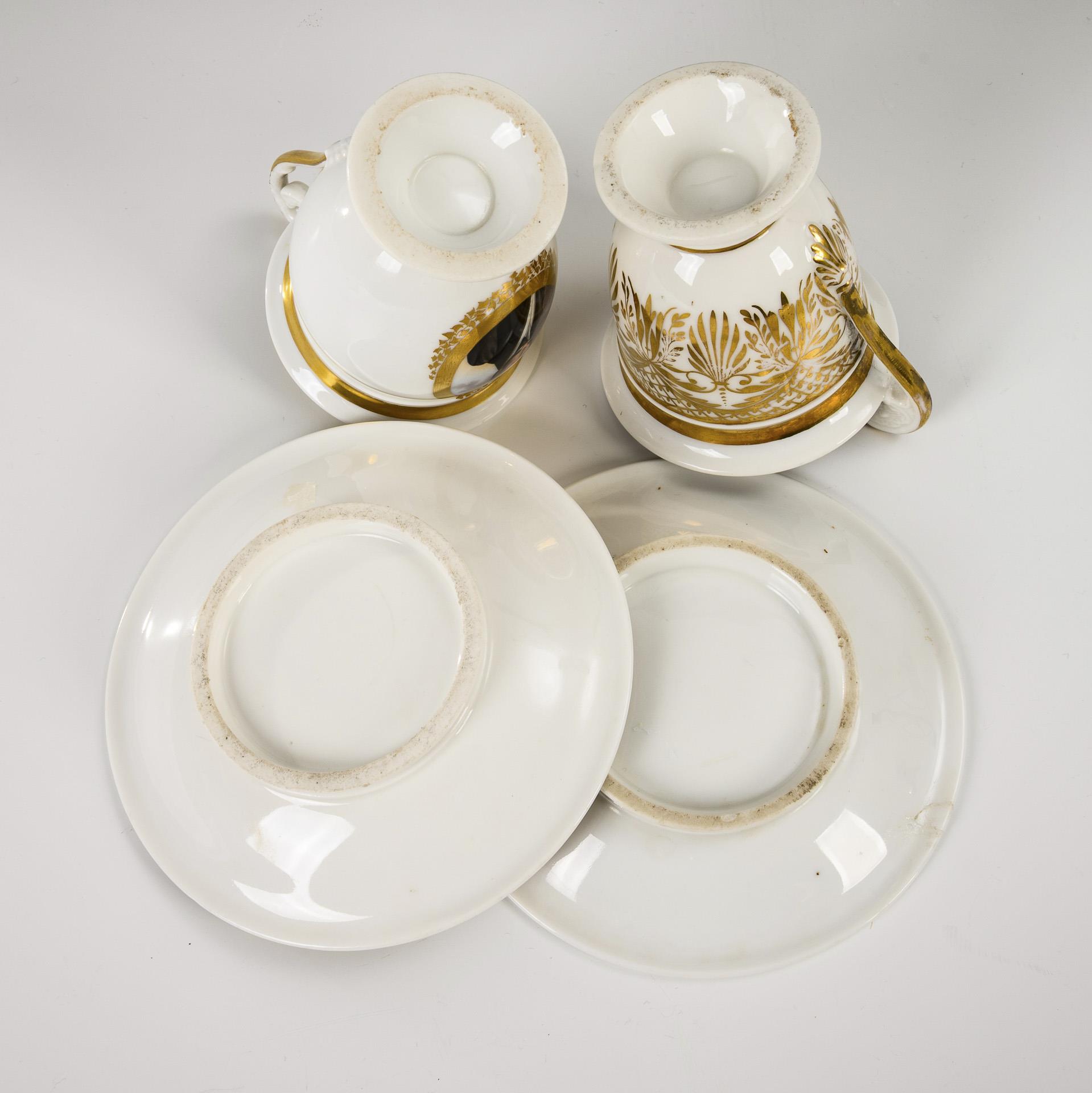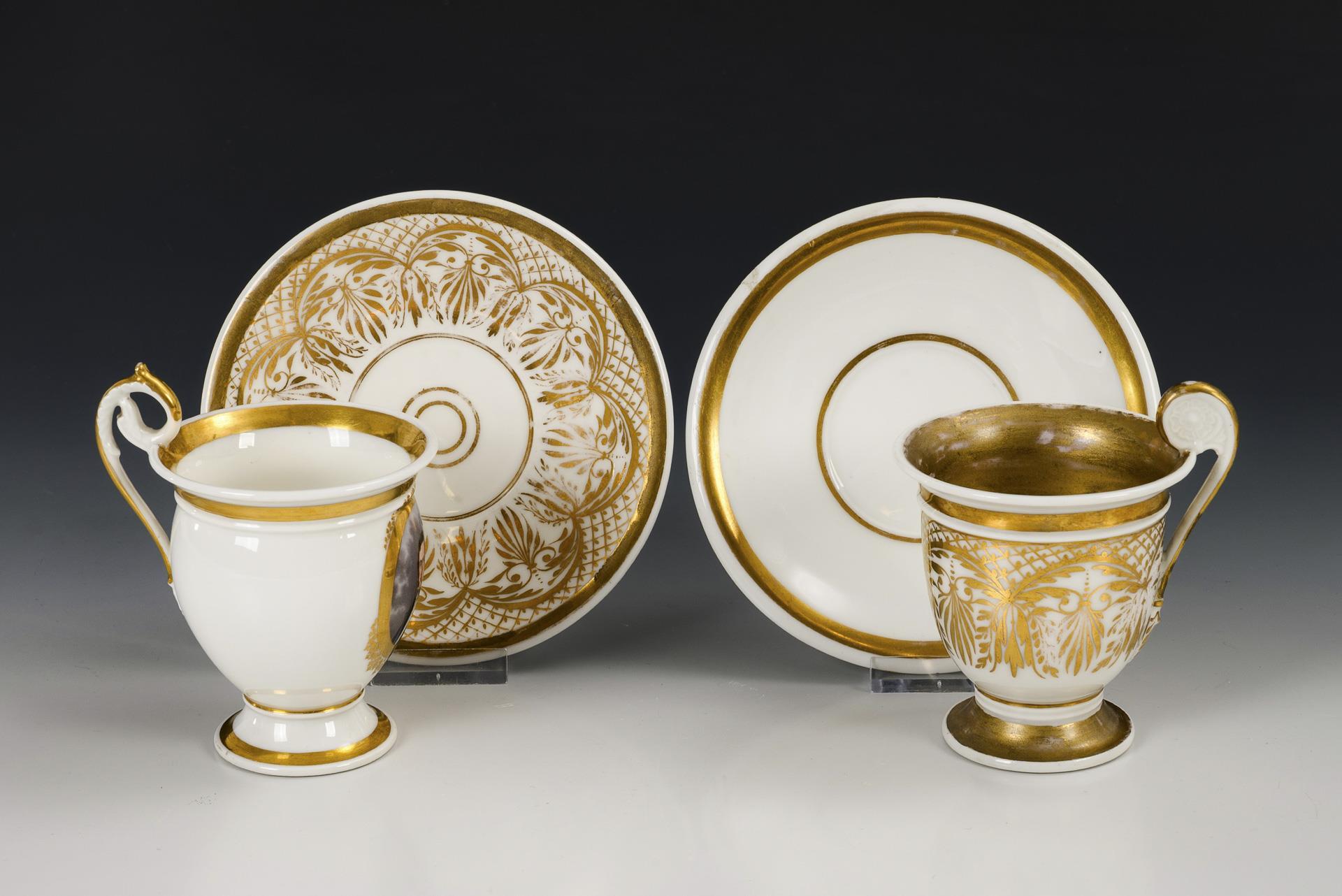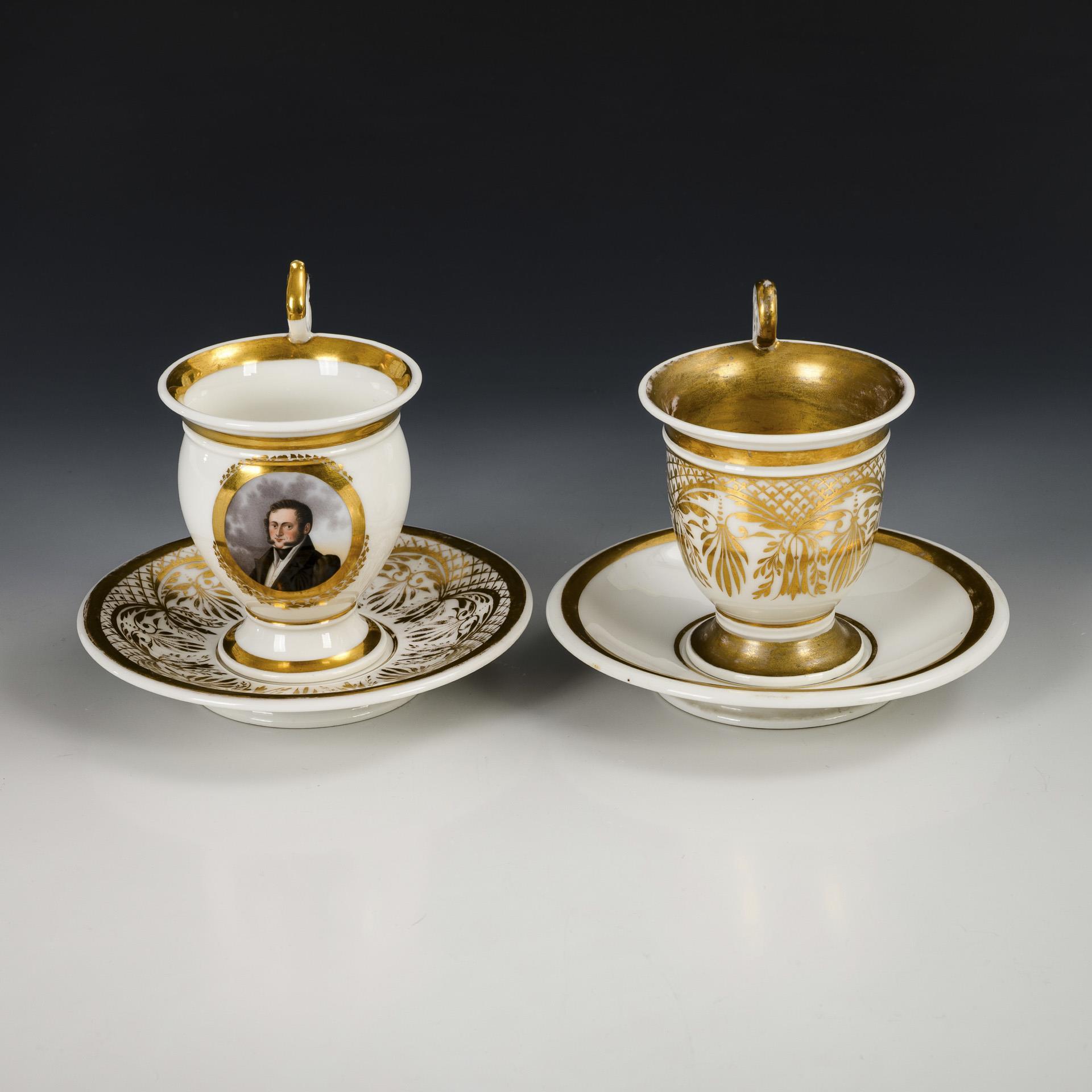Footed bell-shaped cups, 1x with a portrait of a gentleman on the front, 1 with vegetal gold painting. 1x hairline crack in the handle, gold rubbed and partly retouched, 1 saucer with glued edge breakage.