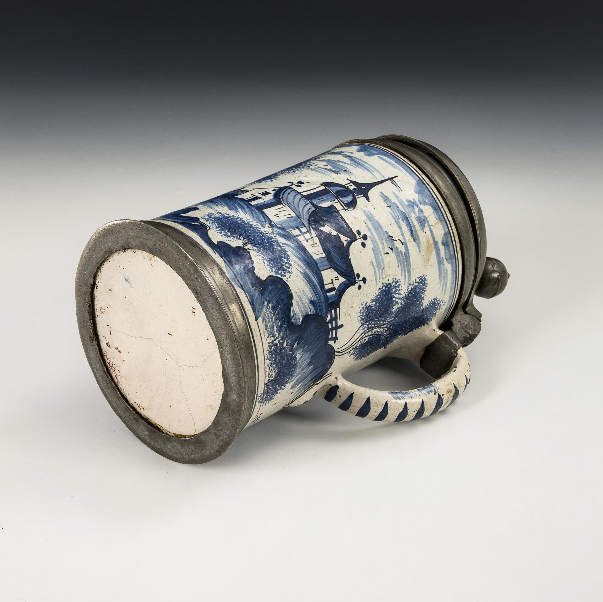 Cylindrical body with decorated band handle, surrounding landscape with group of houses and windmill motif. Pewter lid with ball pusher, engraved and dated "J.C.V. 1795", hallmarked inside, pewter stand ring. Signs of age and wear, finely cracked, glaze cracked.