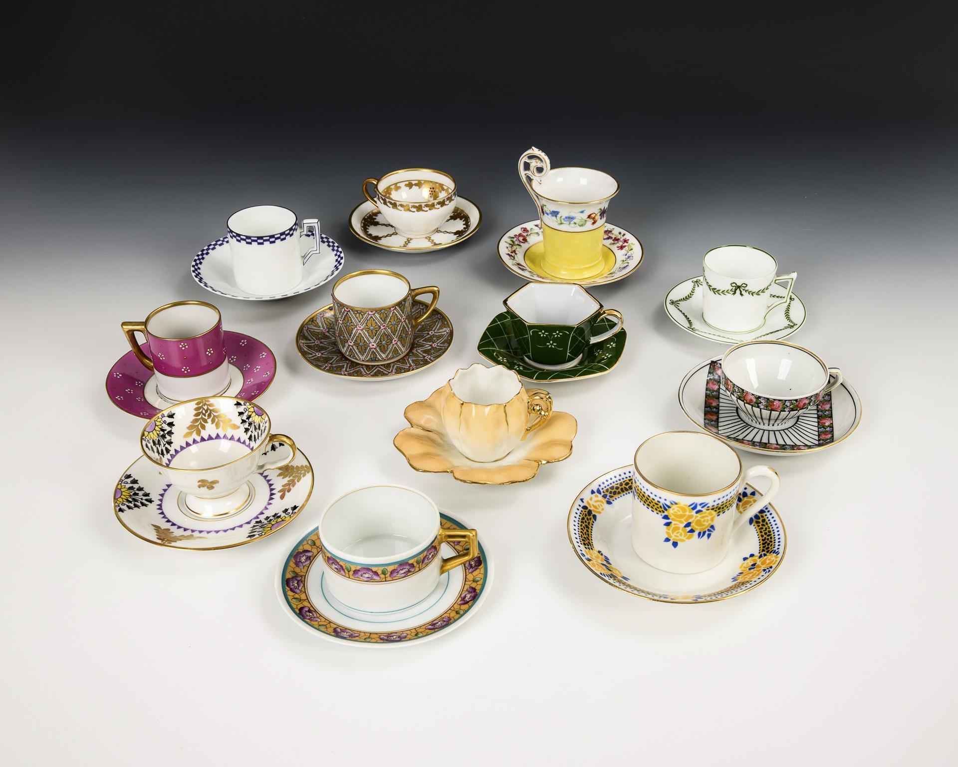 Polychrome painted, partly gold painted. 12 cups (h 3-9 cm), 12 saucers (Ø 10.5-11 cm).