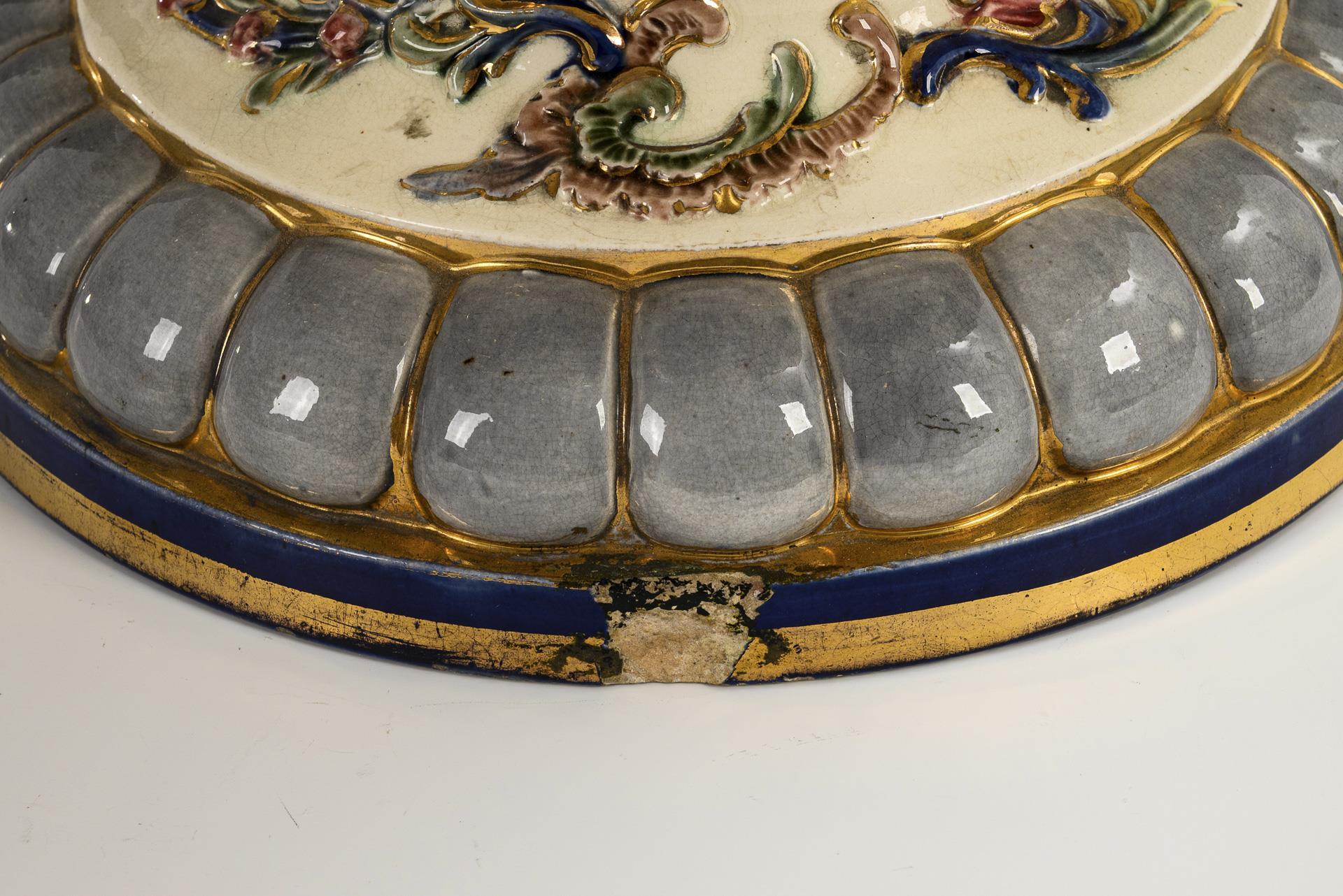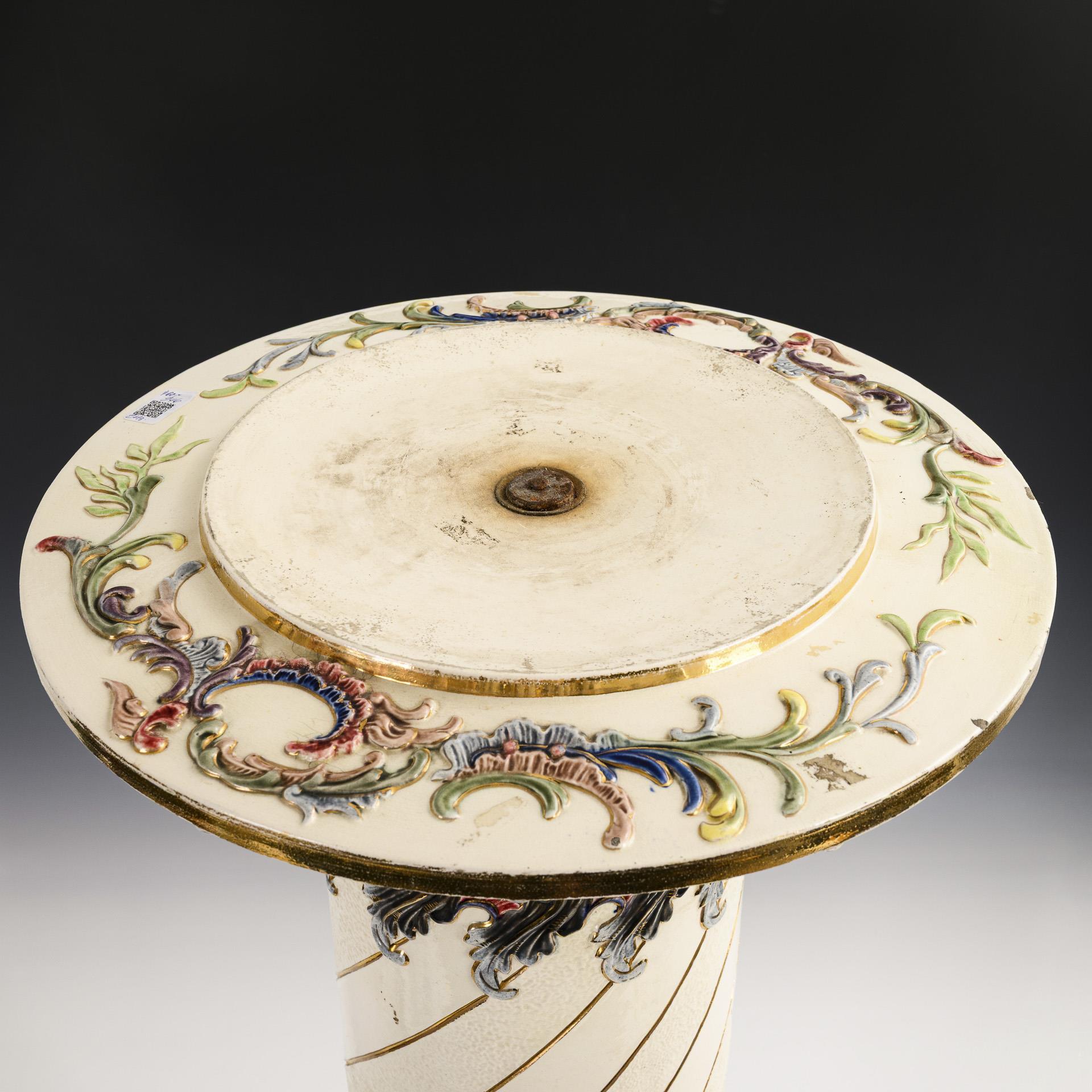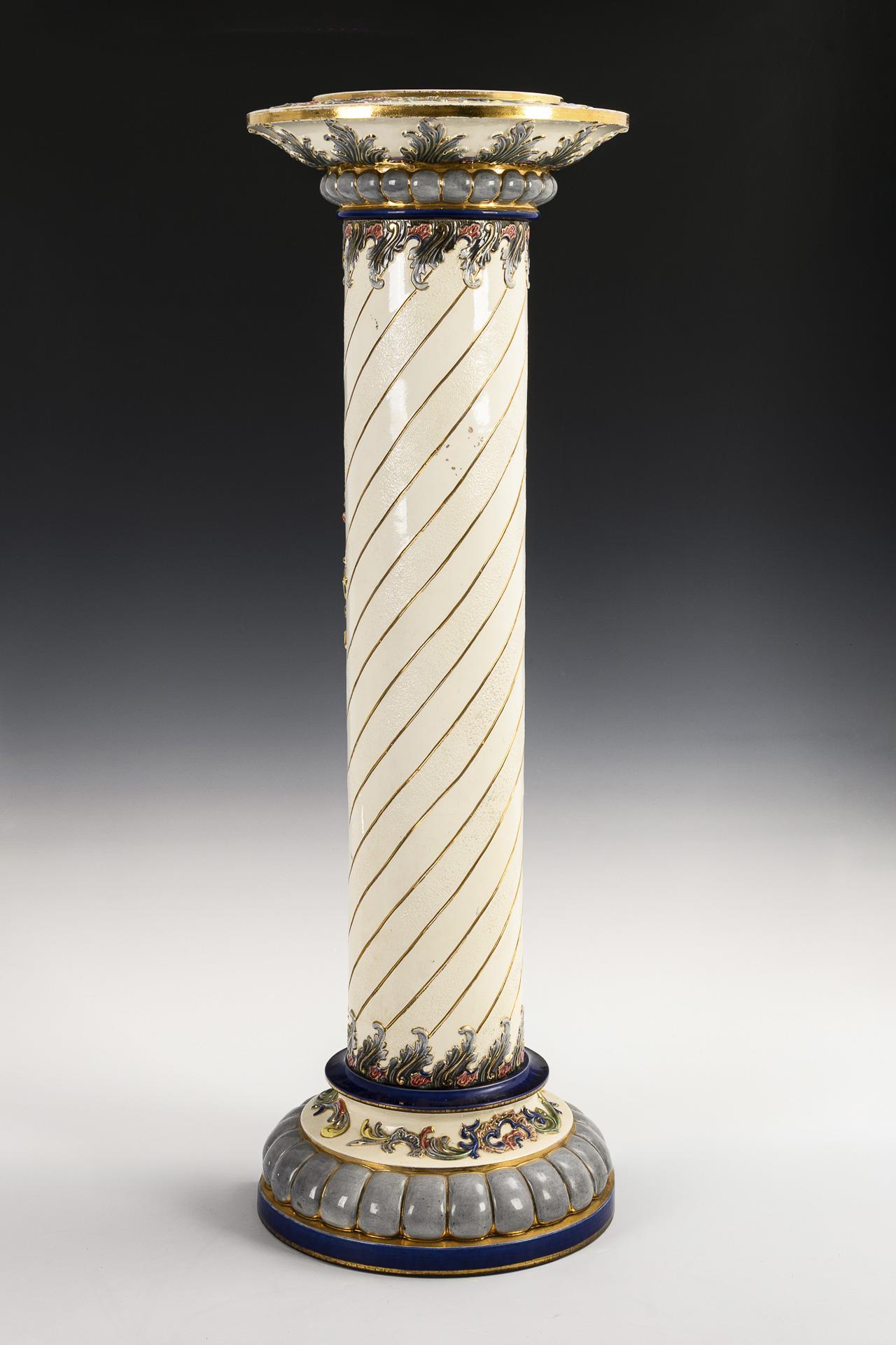 Fine stoneware, decorated in color and gold. Pot H 49.5 cm, Ø outside 51.5 cm, Ø inside approx. 22 cm, column H 108 cm. Pot 8.9 kg, column 19.4 kg.