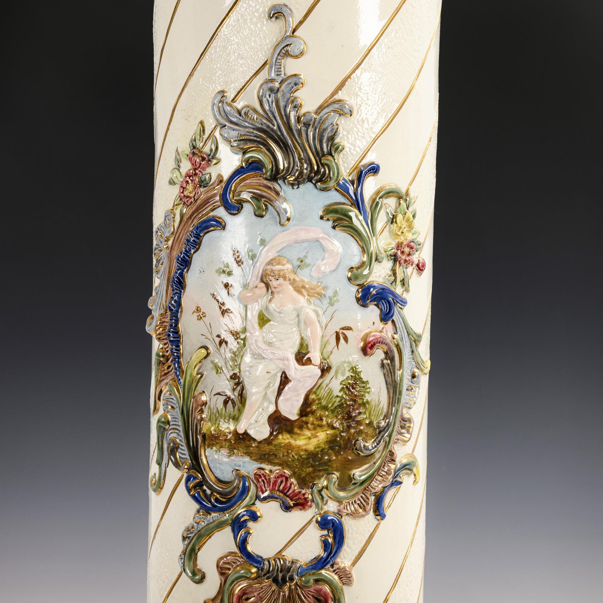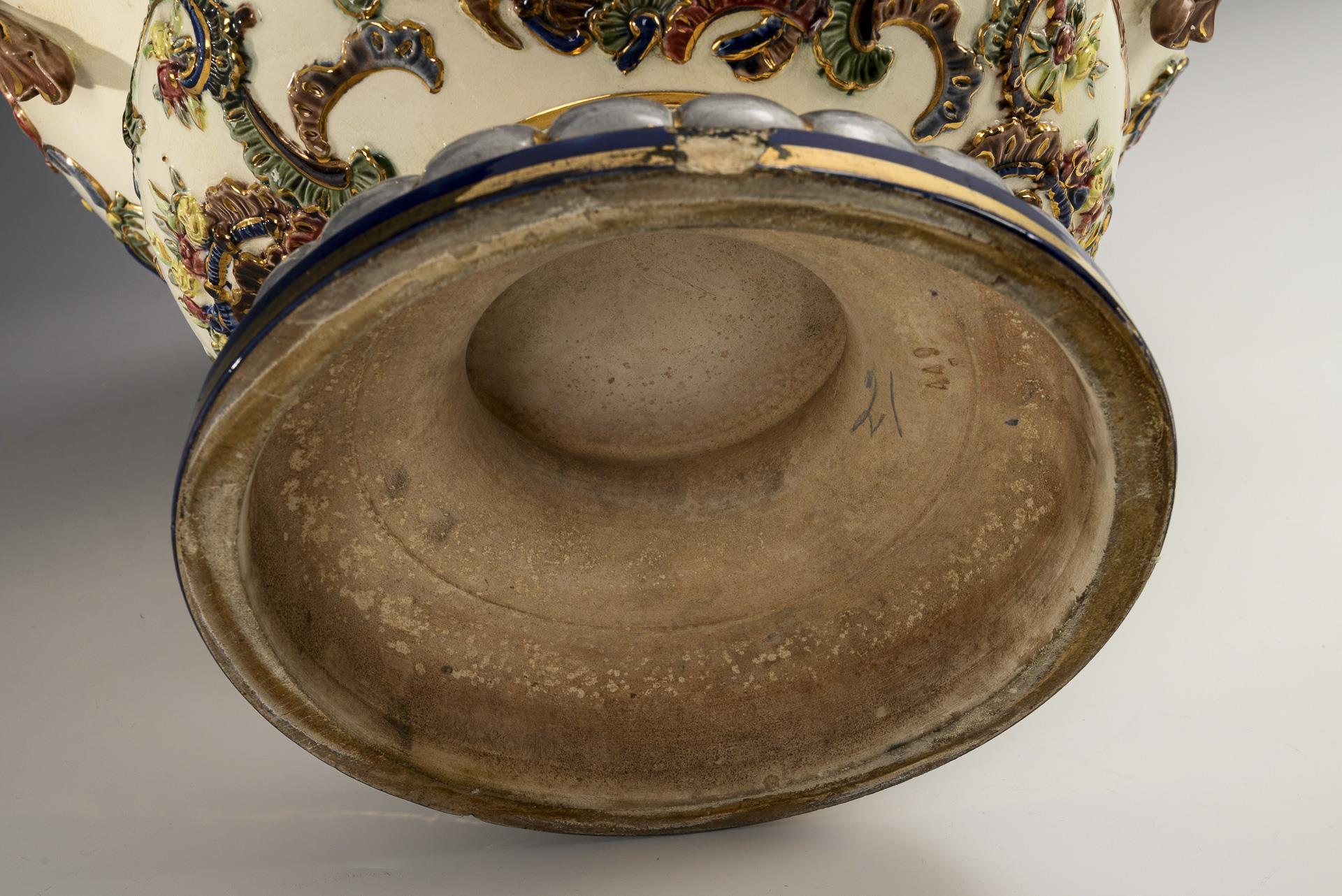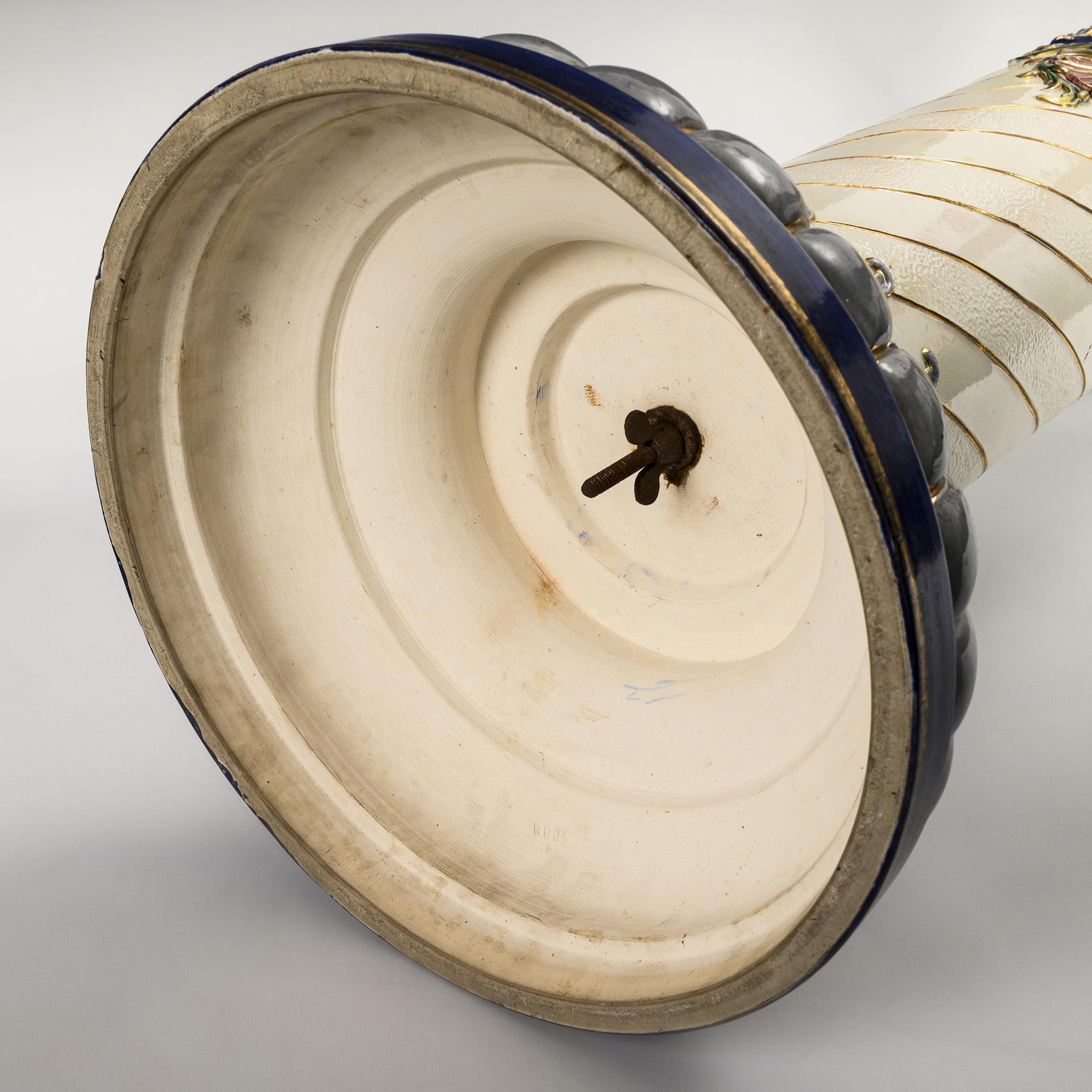 Fine stoneware, decorated in color and gold. Pot H 49.5 cm, Ø outside 51.5 cm, Ø inside approx. 22 cm, column H 108 cm. Pot 8.9 kg, column 19.4 kg.