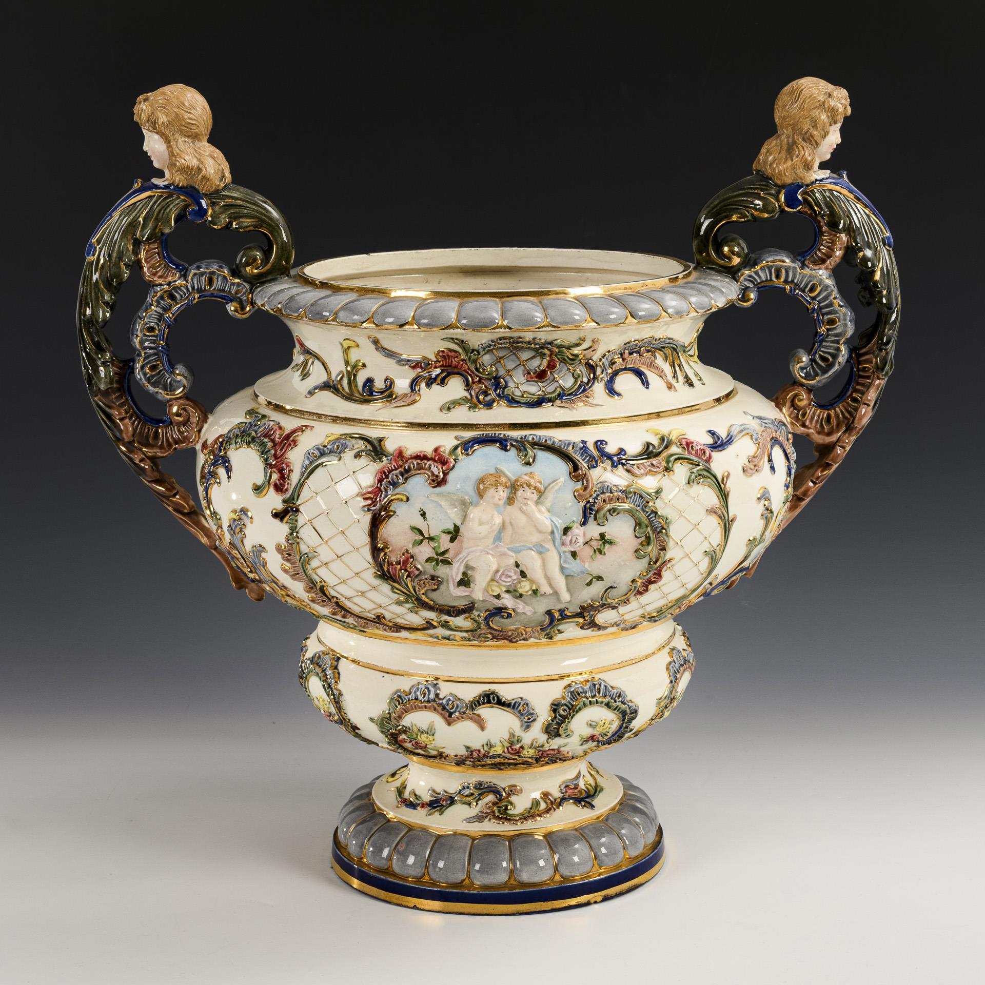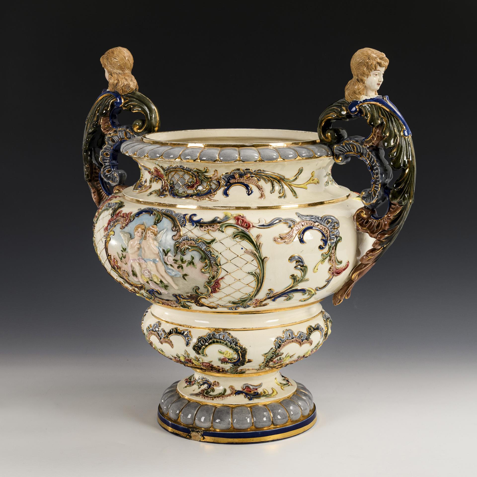 Bellied cachepot with multiple carved walls in relief and 2 high handles with female heads. Rich historicist decoration with putti reliefs, rocailles, foliage and latticework. Matching rounds. Slight signs of age and wear, gold rubbed, chips.