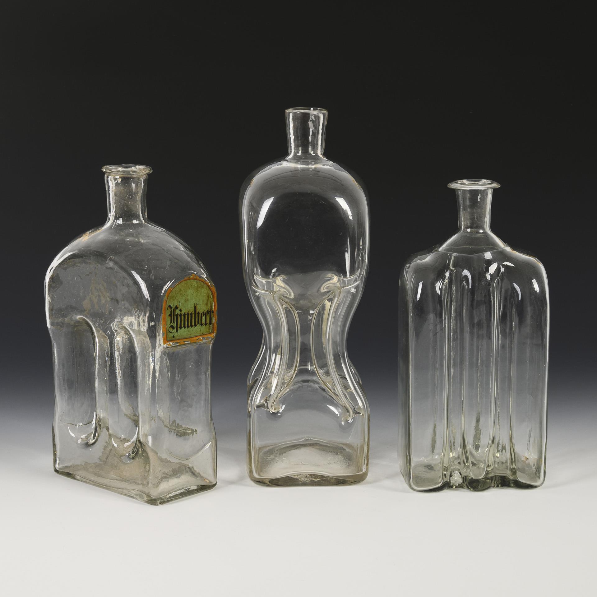 2 square bottles with gripping grooves and 1 square bottle with indented sides, 1x with original enamel inscription "Himbeer".