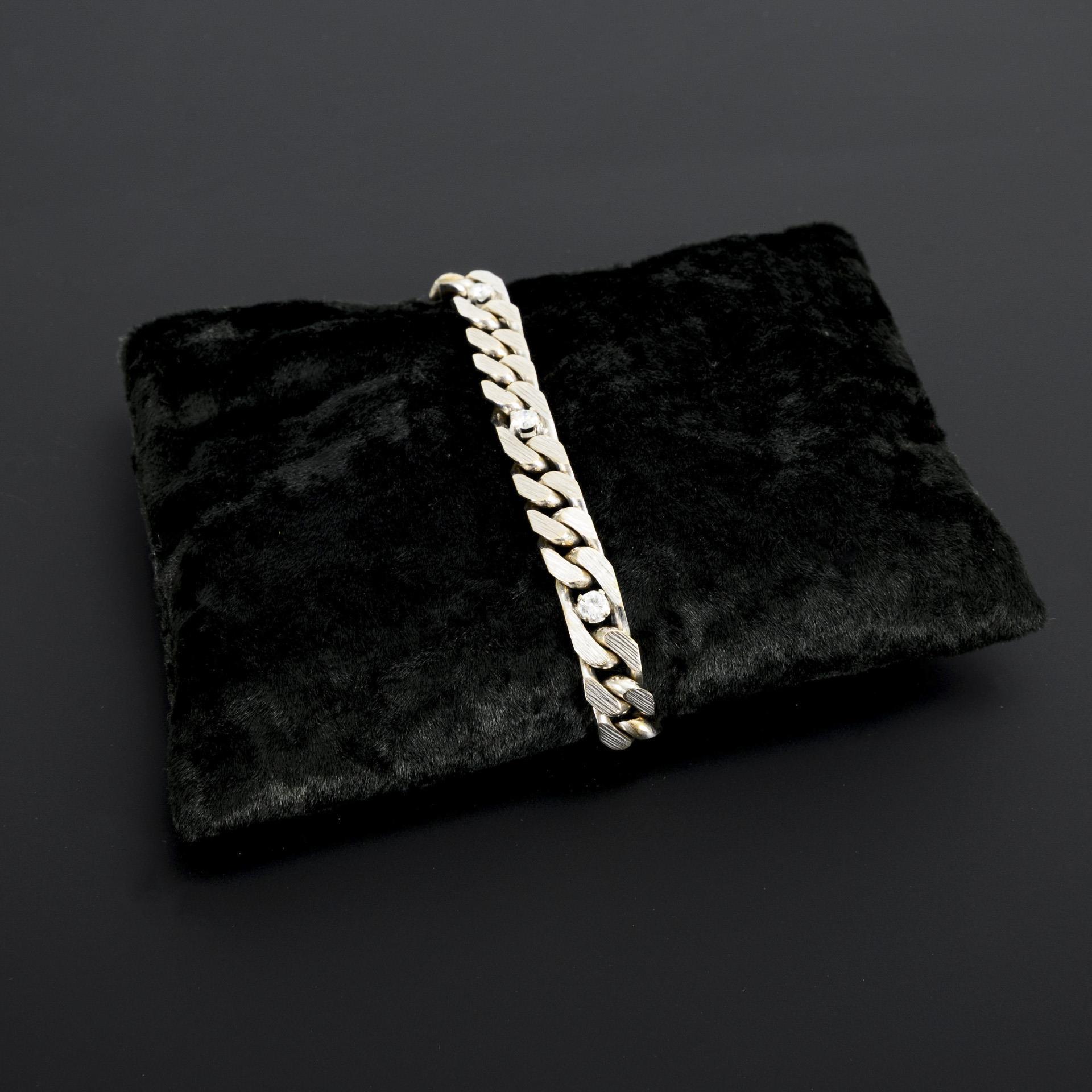 Wide and heavy square curb chain bracelet with 6 chaton-set diamonds, the front with a brushed texture. Box lock with double figure-of-eight safety catch.