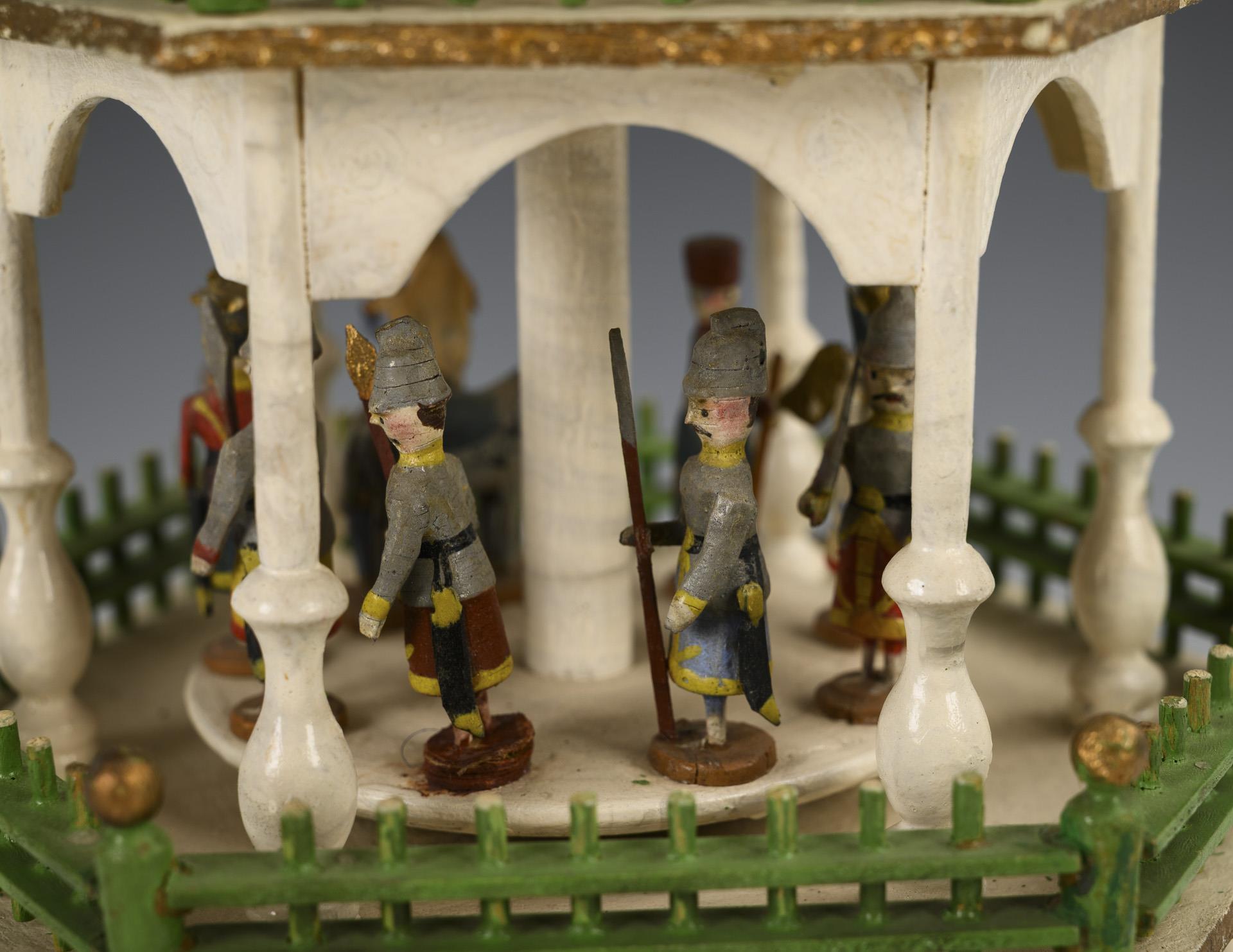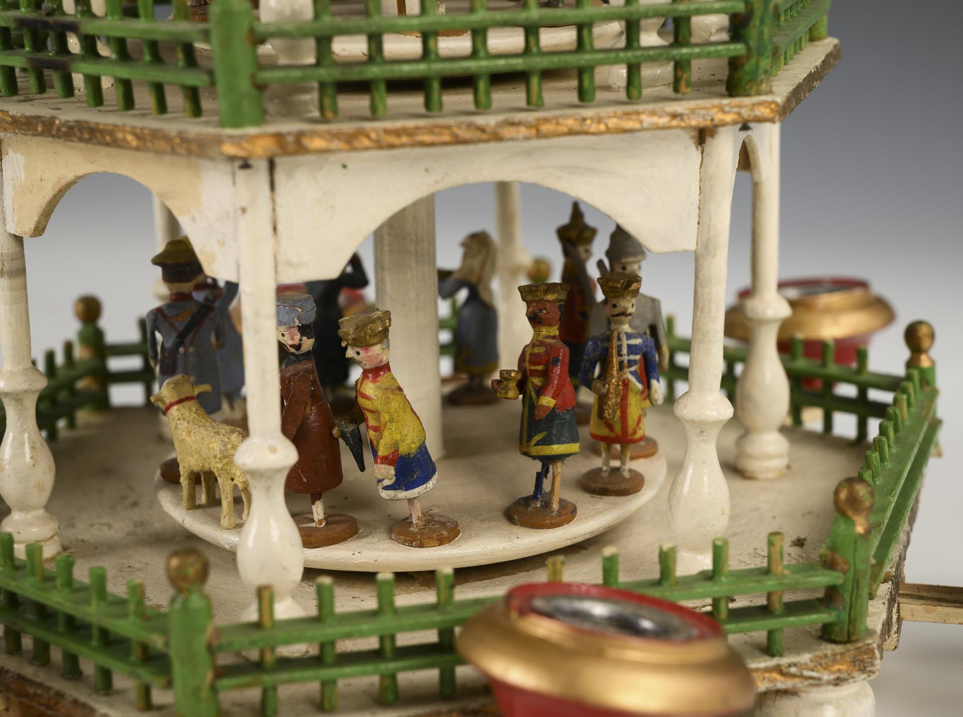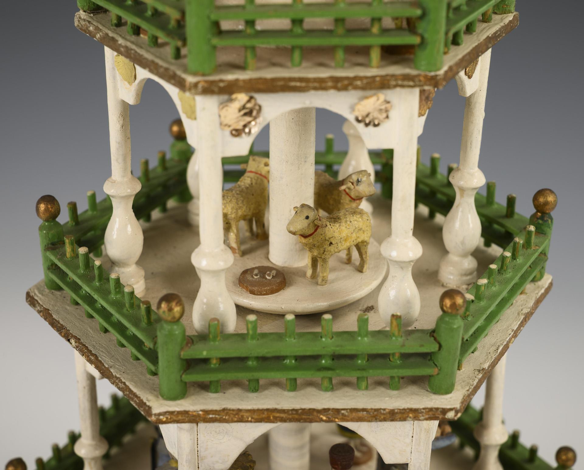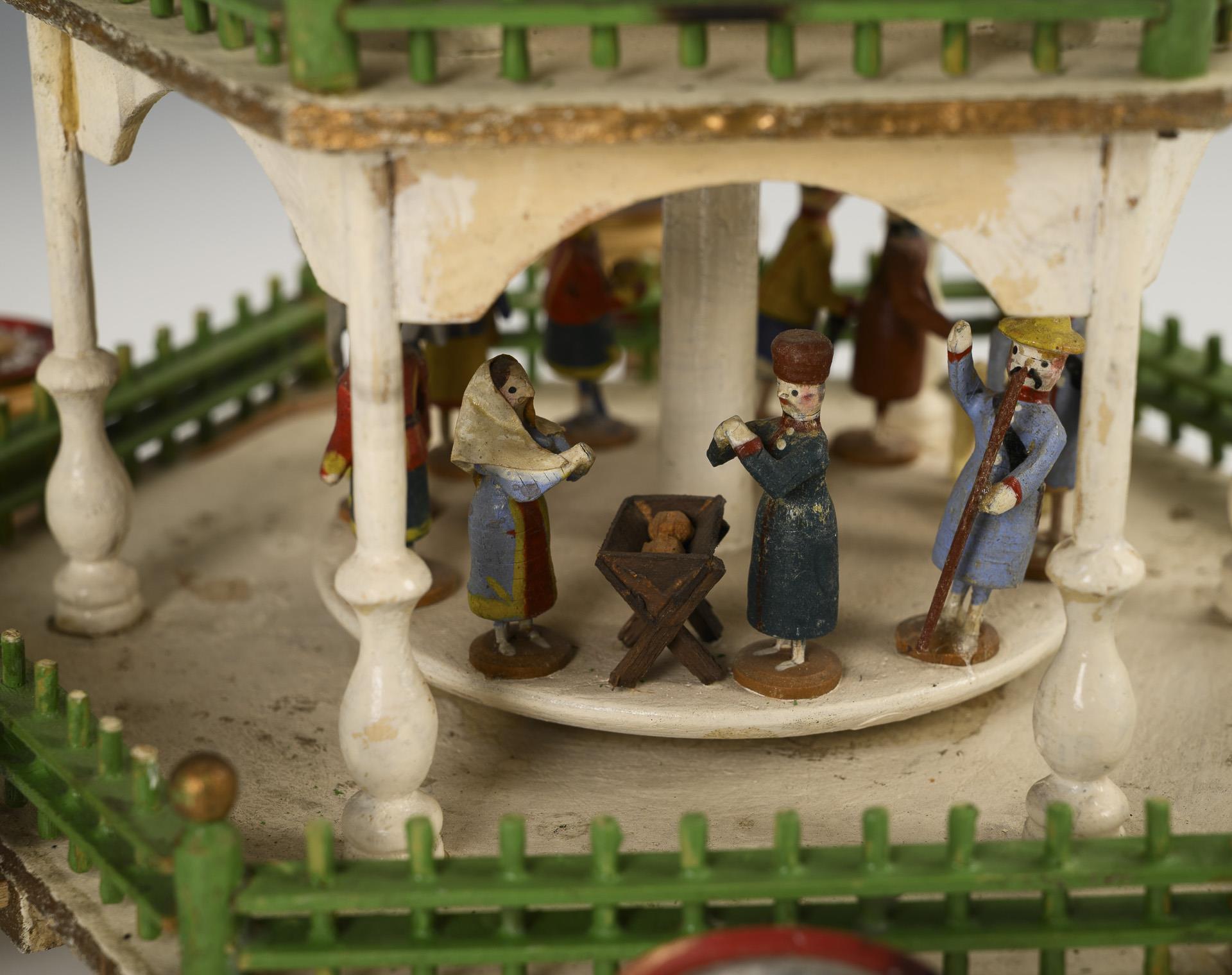 White, 4-tiered Christmas pyramid, with 27 figures by Karl Müller (1879-1958). With defects and repairs, 1 shepherd and 1 winged wheel missing.