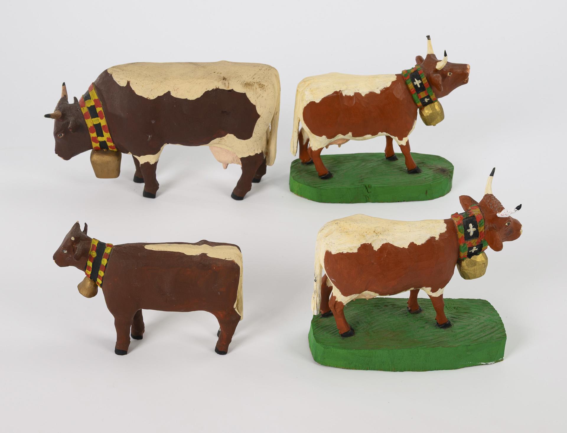 Folk art toy. 2x South Tyrol: by a folk art carver from the Ahrntal, the so-called Roaner, around 1980-90, h 16 and 14.5 cm, each on a green base plate. / 2x Bernese Oberland, Switzerland: cow and large calf from a cow round dance, around 1950-70. H 13.5 and 11.5 cm. Minimal chips and paint defects, 1 horn replaced.